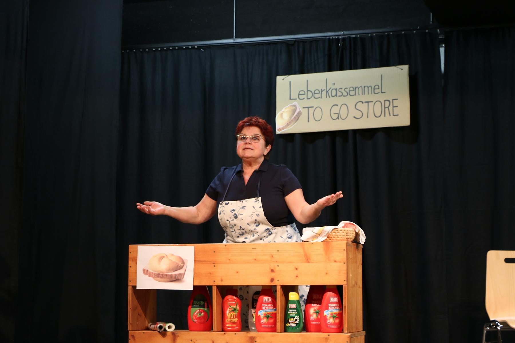 Die Eröffnung war bunt und fröhlich: Unter einem großen regenbogenfarbenen Tuch waren die vier Jahreszeiten und die fünfte Jahreszeit, der Fasching, verborgen, und so konnte der erste Auftritt beginnen. Im ersten Teil wurden humorvolle Stücke wie der „Familienbenutzer“, ein unsinniges Etwas, und der „Leberkäs to Go“-Store aufgeführt. Nach diesem Stück gab es eine Pause, in der das Publikum die Gelegenheit hatte, eine Leberkässemmel zu kaufen. Unglaubliche 60 Semmeln waren in nur 10 Minuten vergriffen. Außerdem standen Brötchen, Sekt und andere Getränke zum Anstoßen bereit.