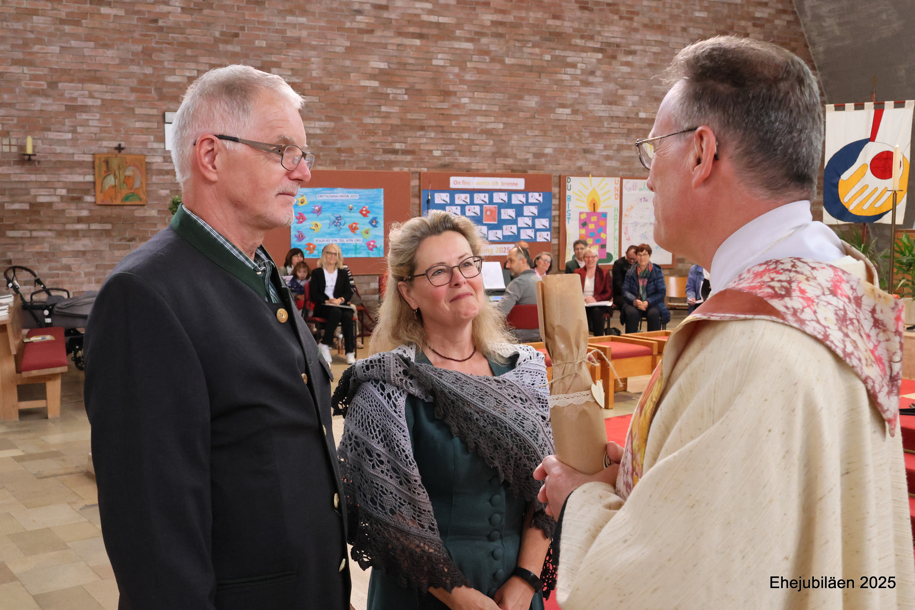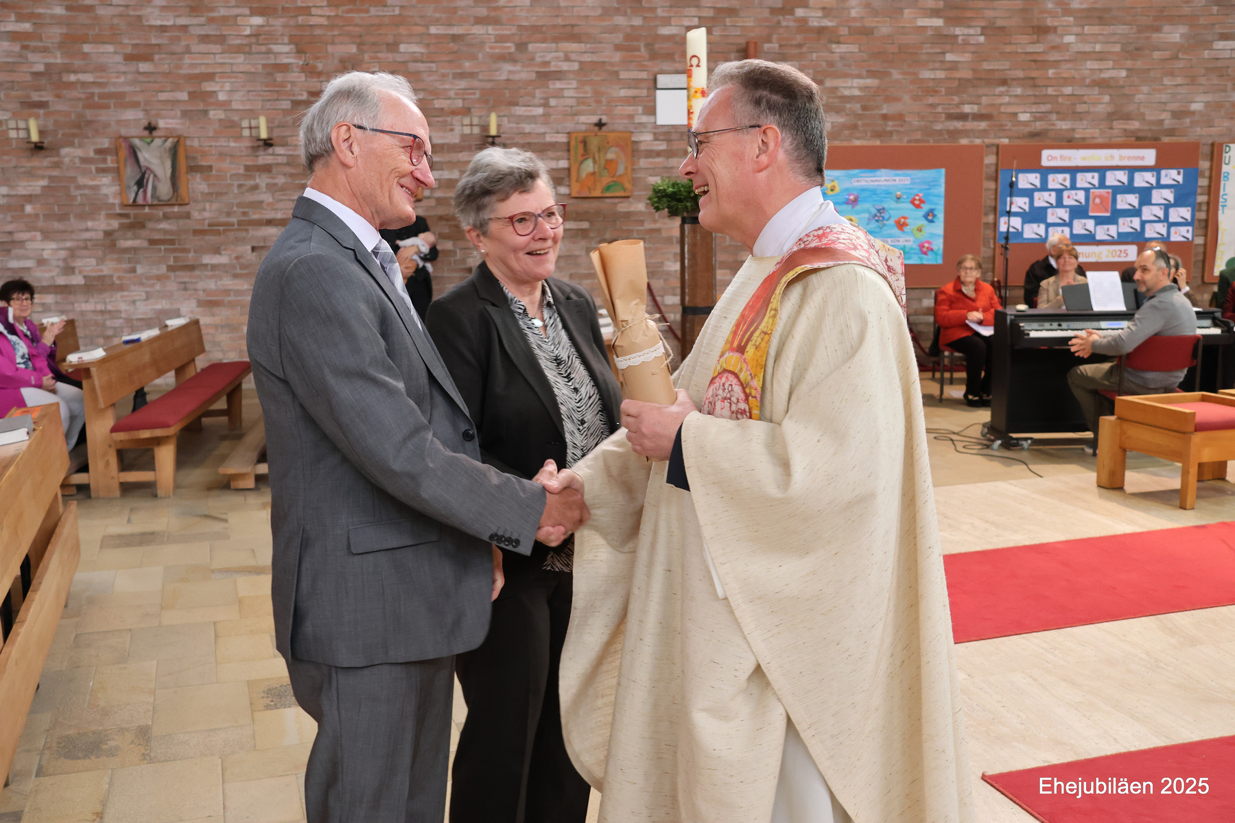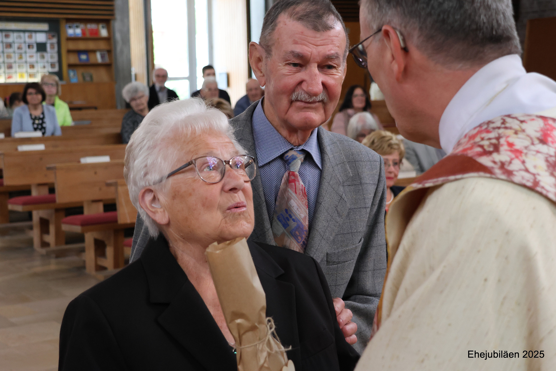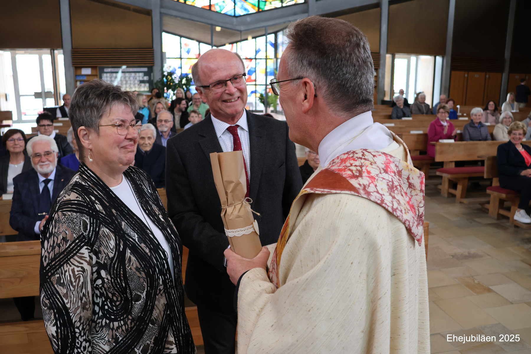 Am Sonntag, dem 25. Mai 2025, fand im Rahmen des Sonntagsgottesdienstes die Feier der Ehejubilare statt. Fünfzehn Paare, die ihr Ehejubiläum zwischen 30 und 65 Jahren feierten, nahmen daran teil. Das "Rezept" für ihre vielen gemeinsamen Jahre wurde durch die folgende Geschichte verdeutlicht:
