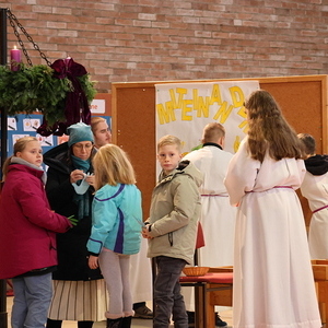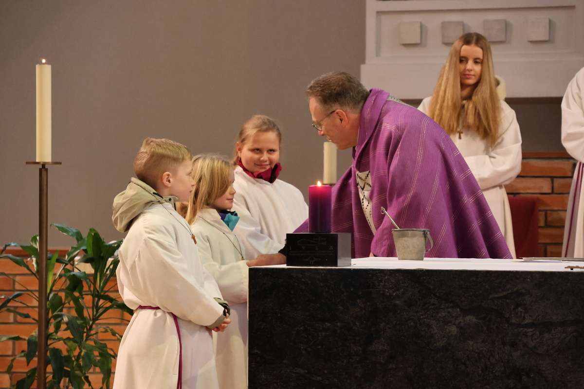 Drei Kinder aus der Volksschule bereiteten sich die letzten Wochen darauf vor. Während der Messe wurde ihnen feierlich ein Ministrantengewand übergeben, das sie mithilfe eines großen Ministranten gleich anziehen durften. Danach wurden Taukreuze von Pfarrer Franz Asen gesegnet und ihnen umgehängt.