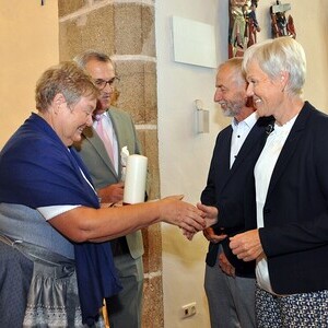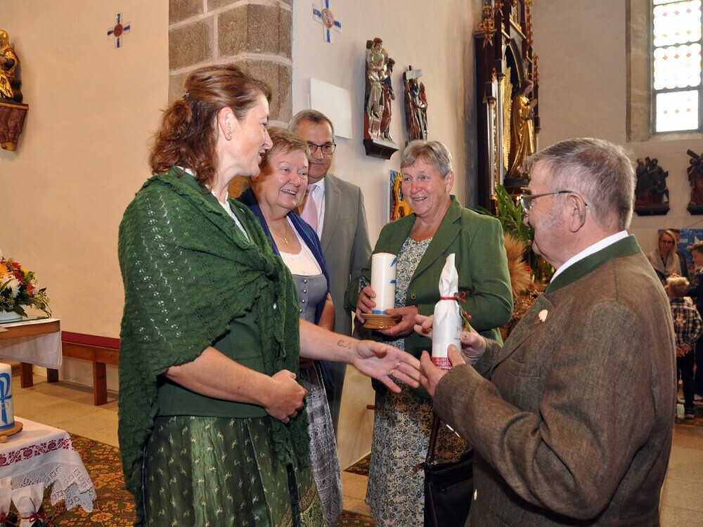 Die Goldhaubengruppe beschenkte jedes Jubelpaar mit einer selbstverzierten Kerze, auch vom Pfarrgemeinderat wurde ein kleines Geschenk überreicht.