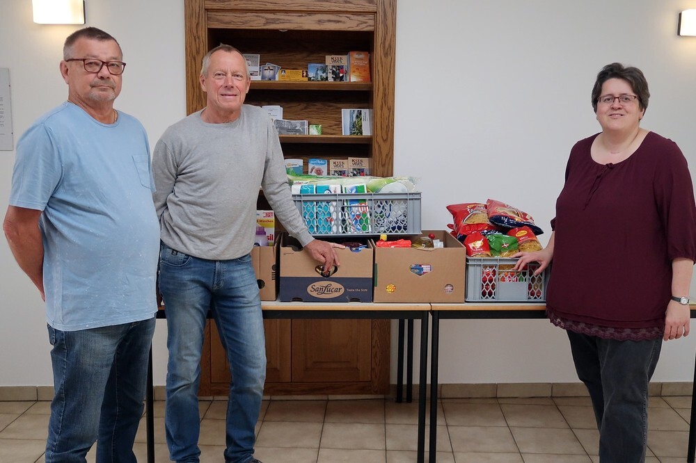 Pfarrassistentin Birgit übergab fünf gut gefüllte Schachteln an Mitarbeiter des Rot-Kreuz-Marktes.