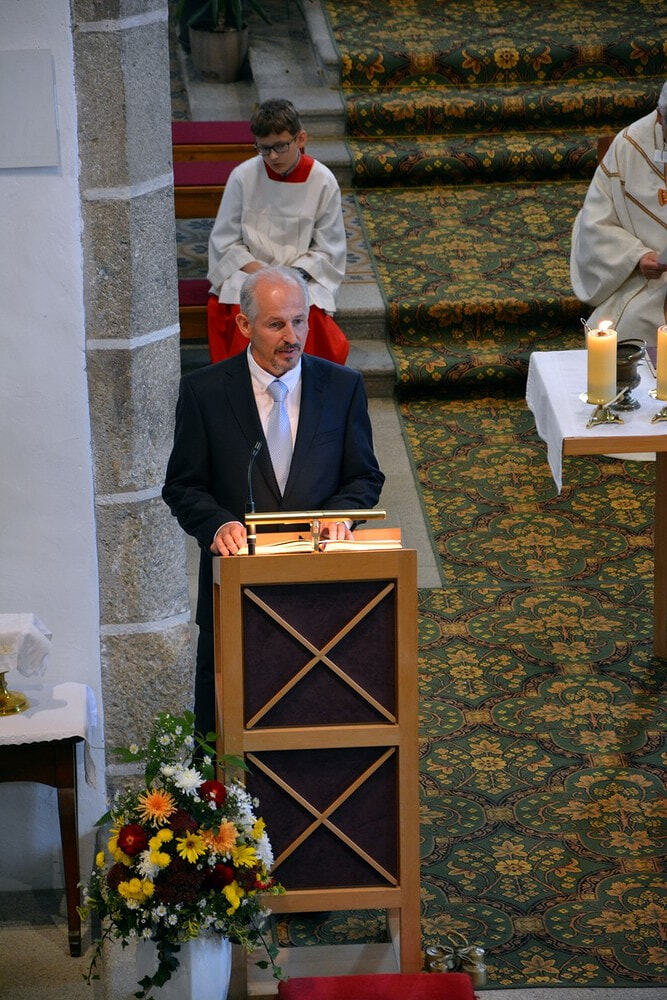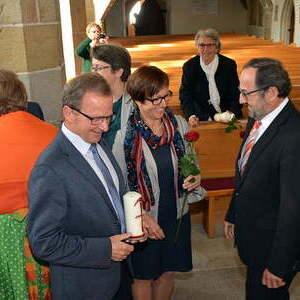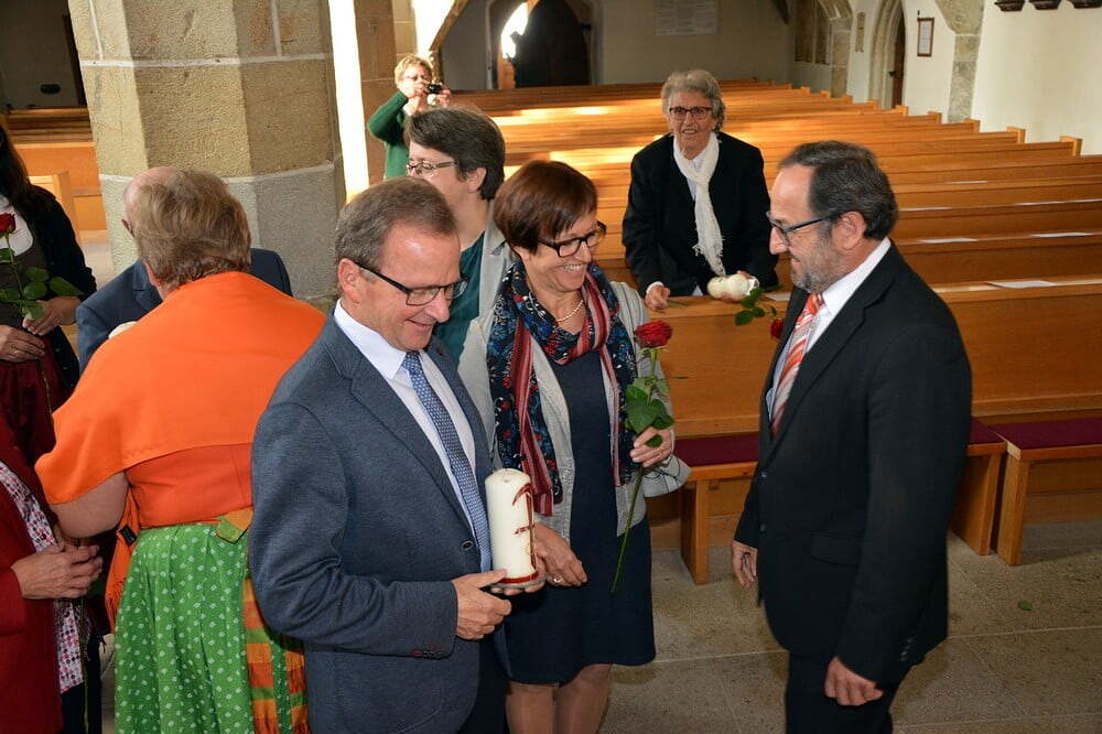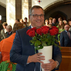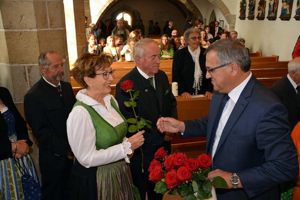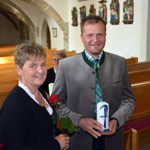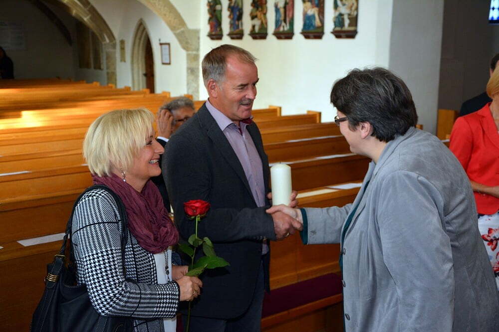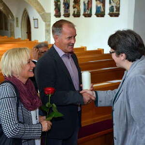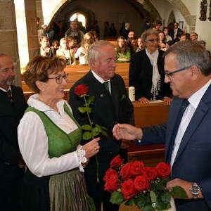 Der Pfarrgemeinderat überreichte rote Rosen und lud im Anschluss zu einem Sektempfang.