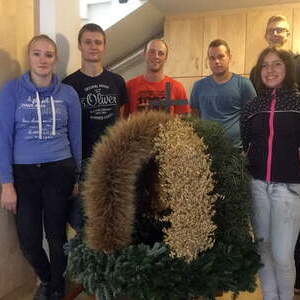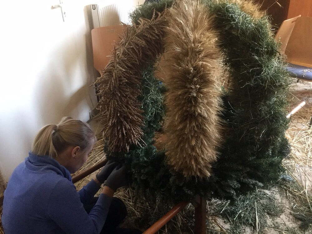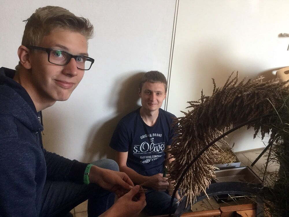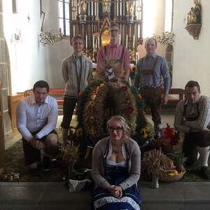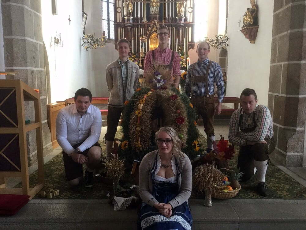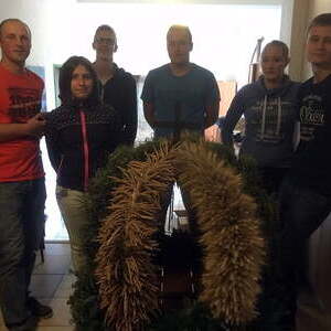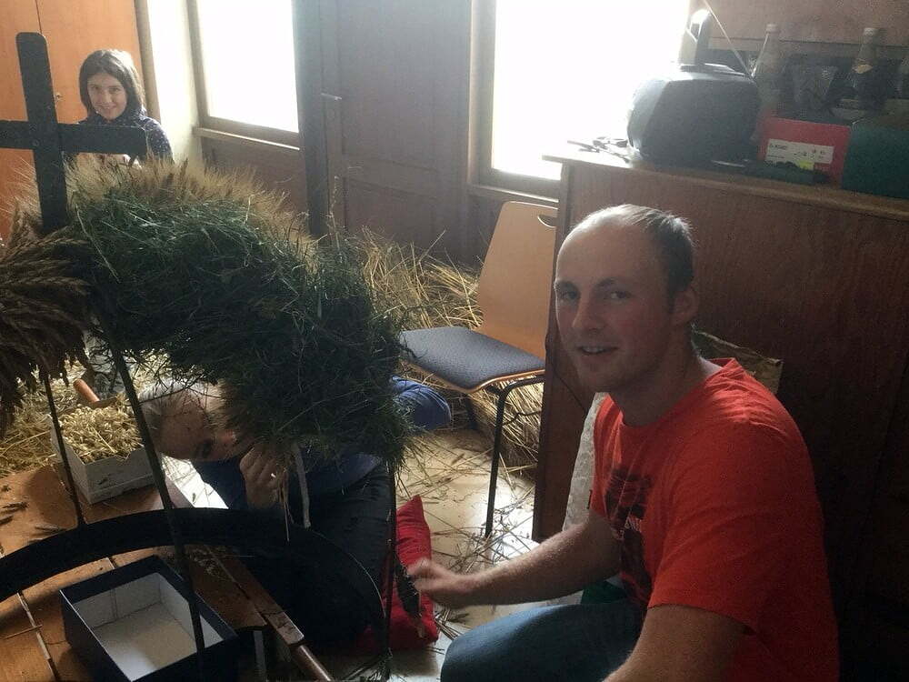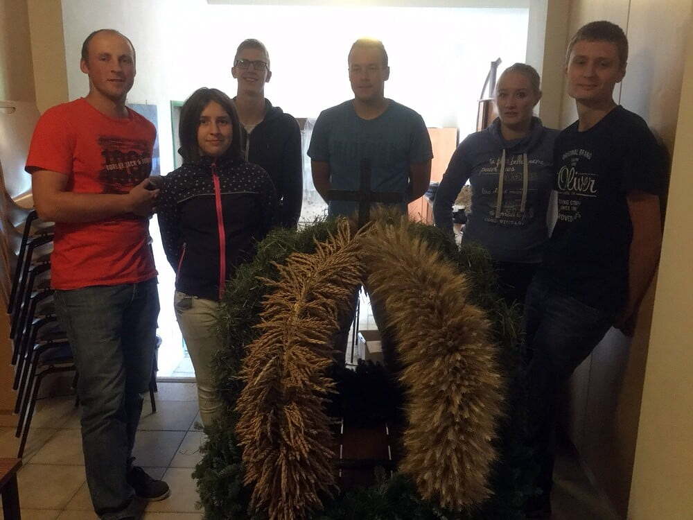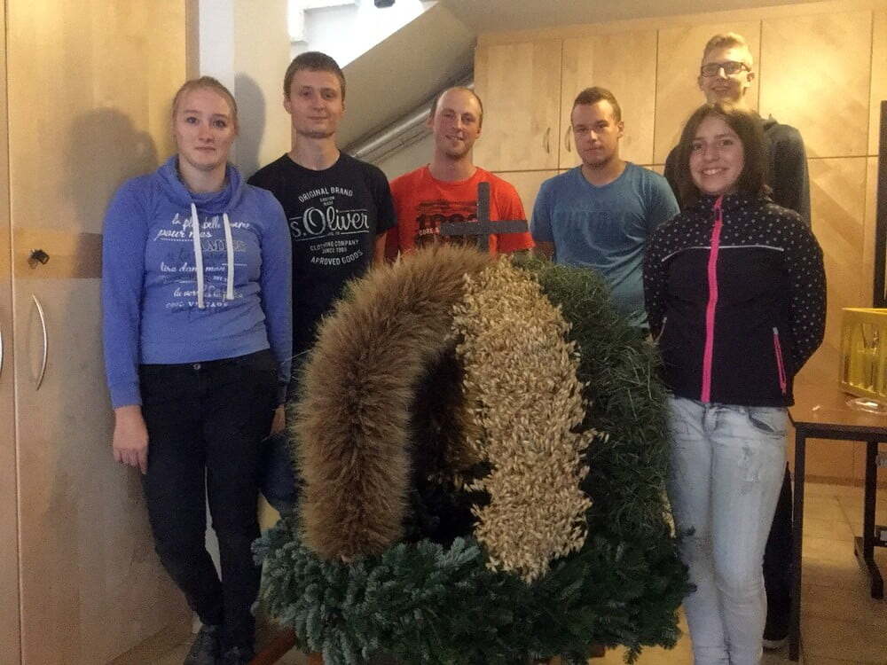 Viele Stunden dauerte es, bis die Erntekrone gebunden war. Einen Tag vor dem Erntedankfest wurde die Erntekrone noch mit Blumen, Obst und Gemüse geschmückt. Ein herzliches Dankeschön unserer kleinen, aber feinen Jugendgruppe!