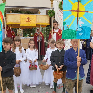Am Fronleichnamstag fand nach dem Festgottesdienst die Prozession statt. Die Erstkommunionkinder gingen bis zur ersten Station - die Spitalskapelle - mit und warteten bei der Mangerkapelle auf die Prozession. In der Zwischenzeit gestalteten sie ein Blütenbild. Viele Vereine und Körperschaften rückten aus und gingen mit, wodurch der Festzuug ein feierliches Ambiente gewann. Nach der Station in Scharnstein vor der Kirche, ging es zurück zur Pfarrkirche Viechtwang, wo am Kirchenplatz der Schlusssegen erfolgte.