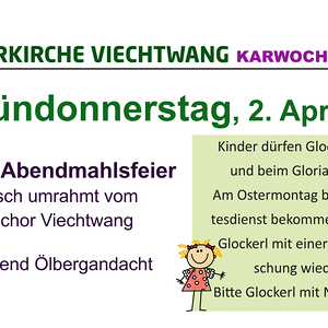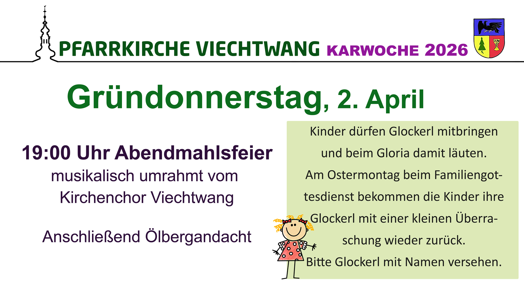 Kinder dürfen Glockerl mitnehmen und beim Gloria damit läuten. Am Ostermontag bekommen die Kinder das Glockerl mit einer kleinen Überraschung wieder zurück. Bitte Glockerl mit Name versehen!