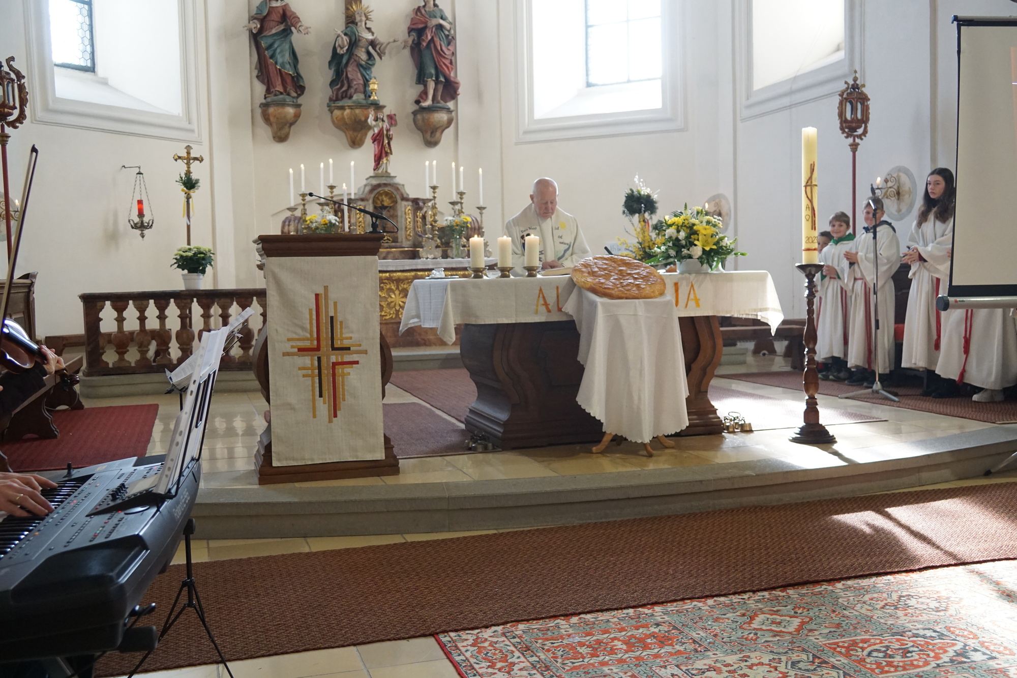 Aufgrund des regnerischen Wetters fand die Palmweihe im Stadl des Kaplanstockes statt. Die Bläsergruppe umrahmte die Andacht. Der anschließende Gottesdienst in der Kirche wurde von den Erstkommunionkindern mitgestaltet. Beim Standerl konnten Palmbuschen gegen eine Spende erworben werden. Vielen Dank an die fleißigen Kfb Frauen fürs Palmbuschen binden.