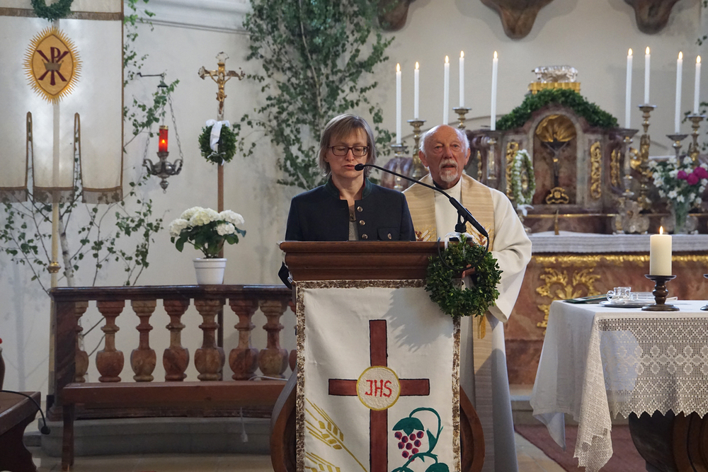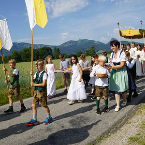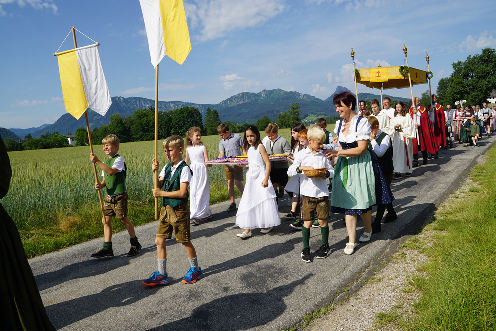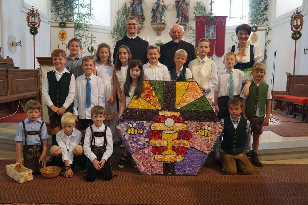 P. Christoph Eisl feierte in Viechtwang den Gottesdienst und die Prozession. Diese Mal führte die Prozession bei strahlendem Sonnenschein übers Moar. Auch die Erstkommunionkinder waren eingebunden und gestalteten ein Blumenbild.
