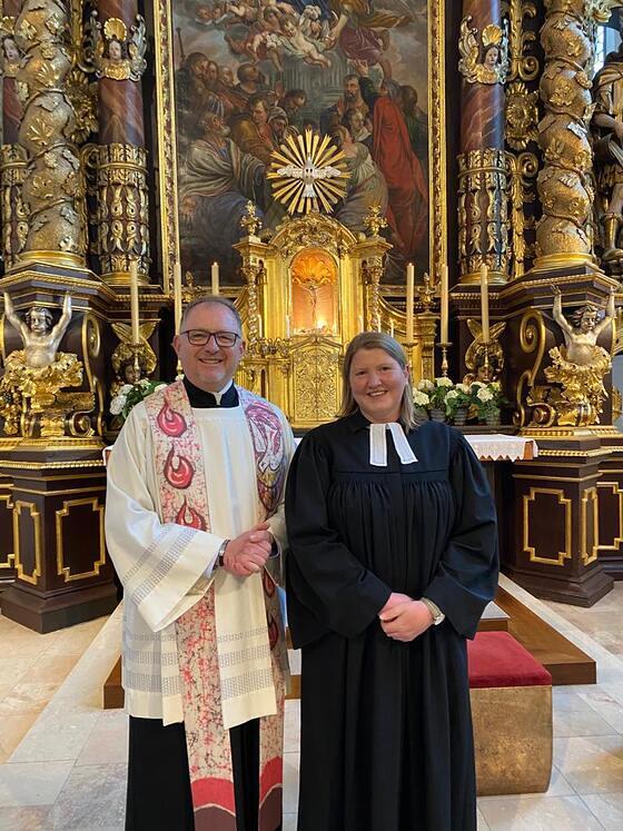 Dazu kam die evang. Pfarrerin Petra Grünfelder aus Timelkam zu uns nach Vöcklamarkt um gemeinsam mit Pfarrer Wolfgang Schnölzer der Feier vorzustehen. In der Pedigt spach die Frau Pfarrerin über den Heiligen Geist, den sie anhand des Liedes "Komm herab, o Heiliger Geist (GL 344)" erläuterte.