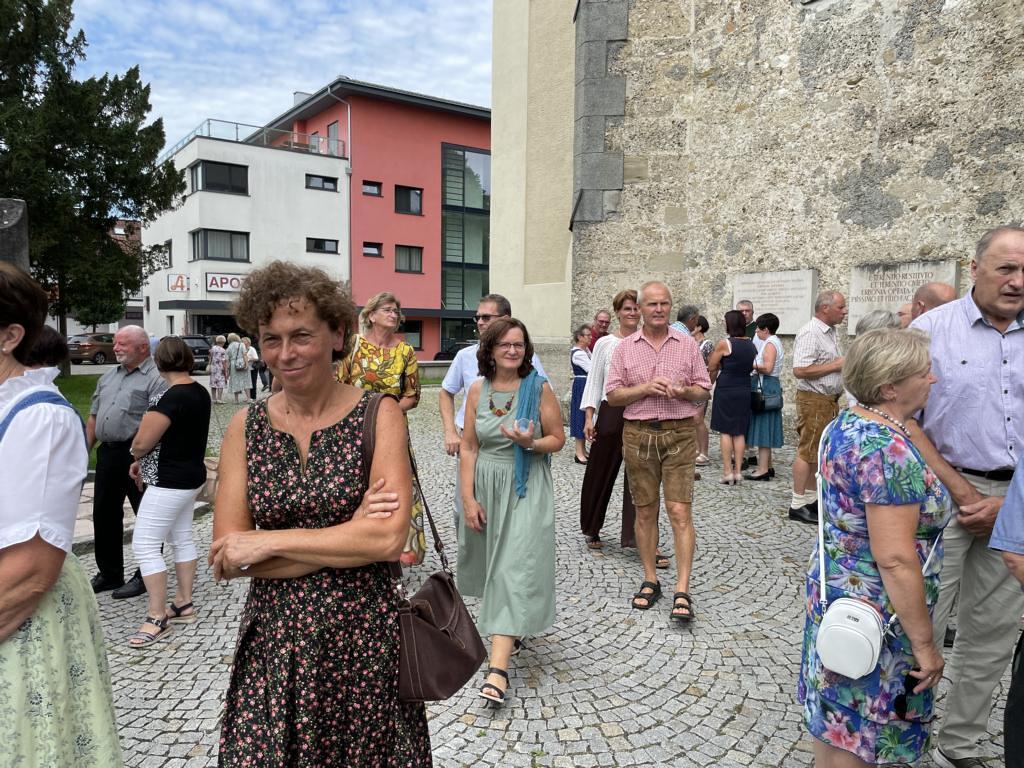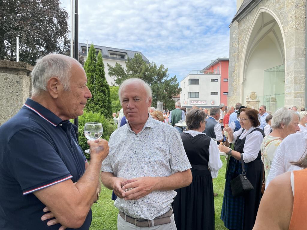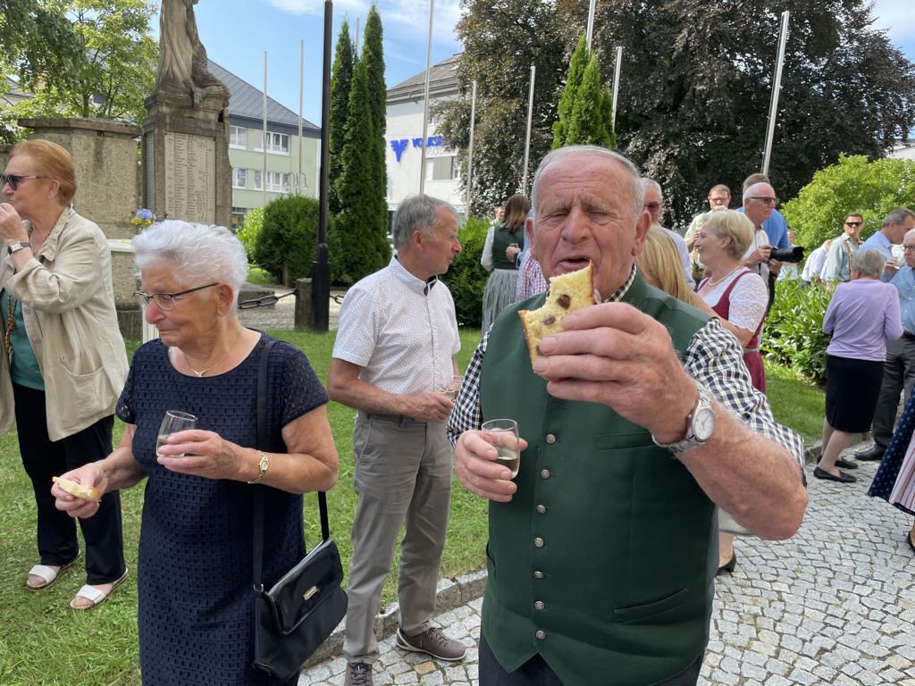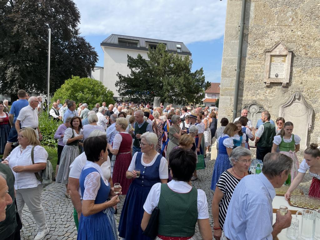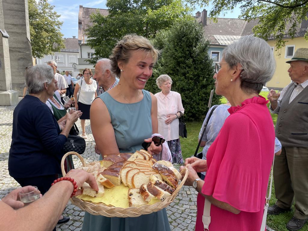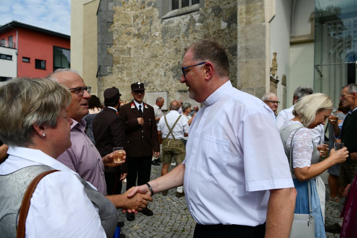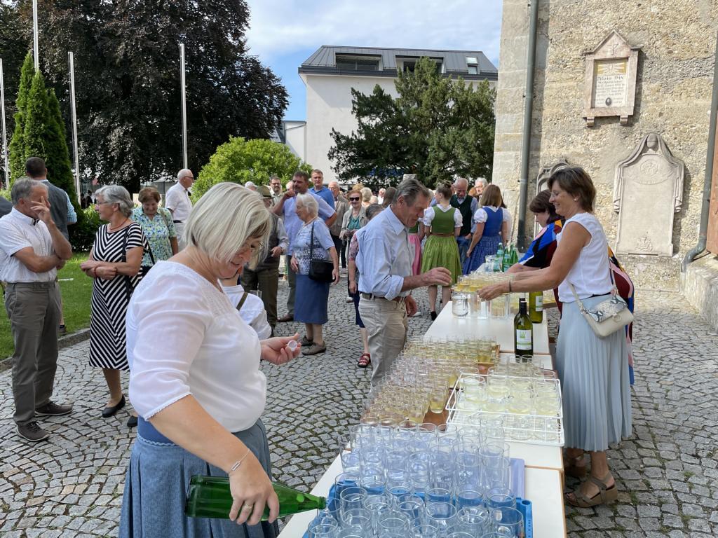 Nach dem Gottesdienst hatten noch alle vor der Kirche bei einer Agape Gelegenheit, auf Wiedersehen und Adieu zu sagen. Dazu kamen auch die Marktmusikkapelle, die Prangerschützen mit einem Ehrensalut, die Landjugend, Abordnungen der Goldhaubenfrauen, der Pensionist/-innen und der Feuerwehr und ganz viele Vöcklamarkter/-innen und Pfaffinger/-innen. Allen war es ein wirkliches Anliegen, dem verehrten Herrn Pfarrer Dank auszudrücken und für die Zukunft alles Gute zu wünschen.