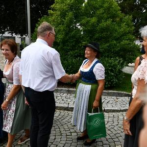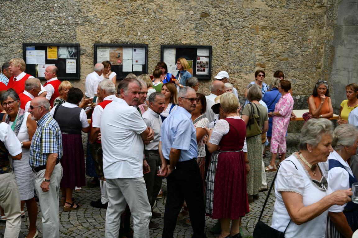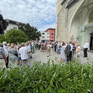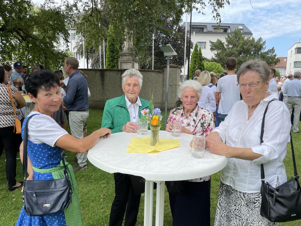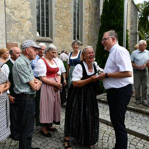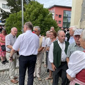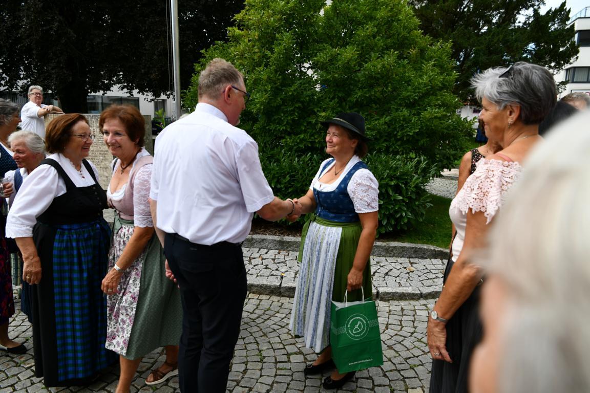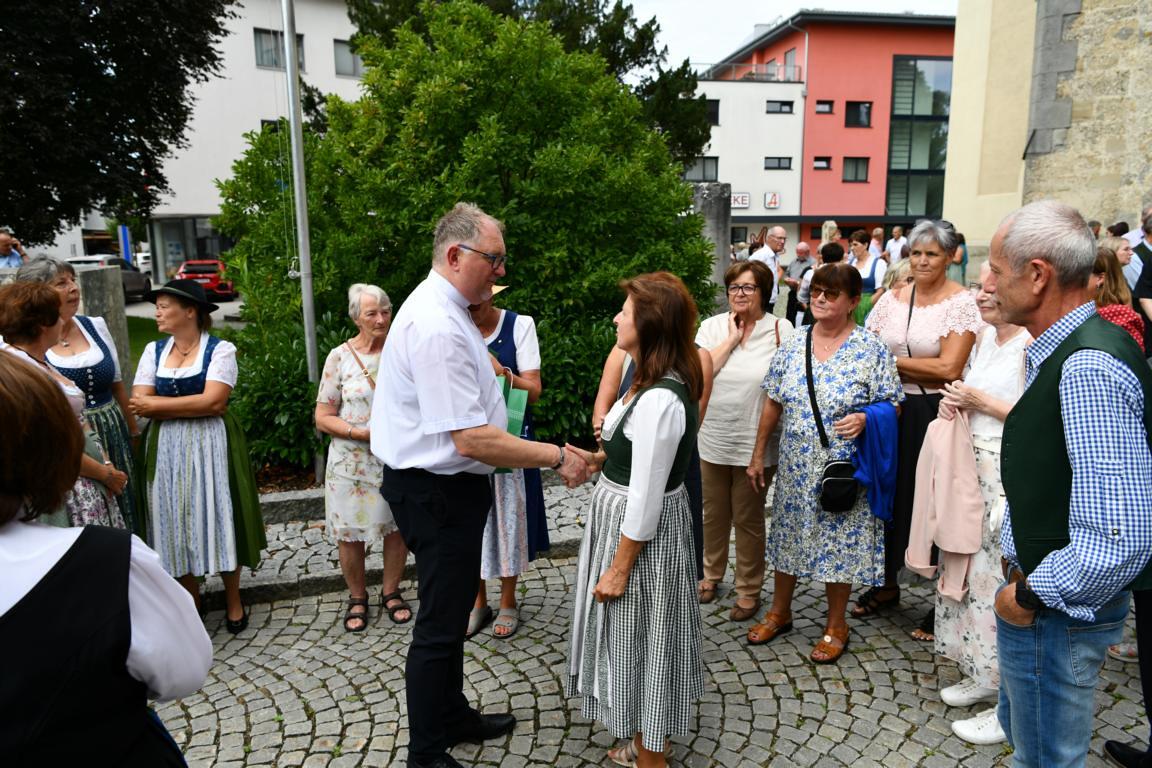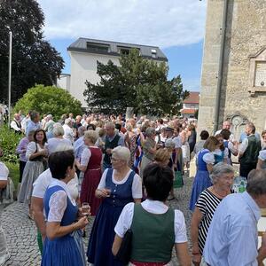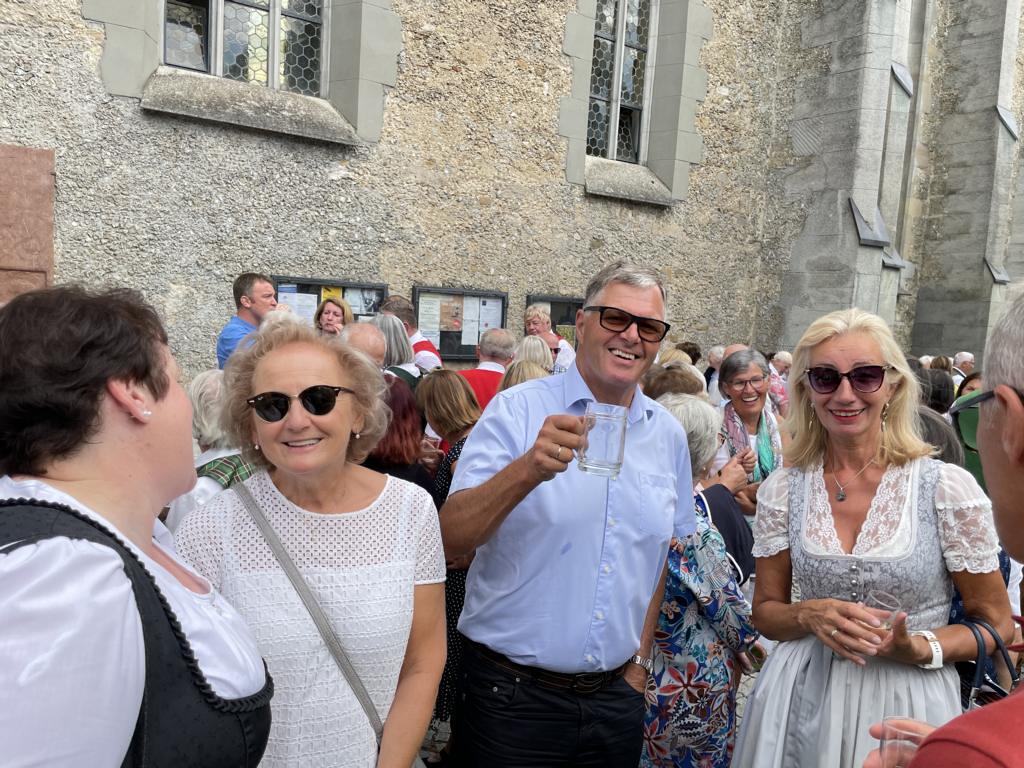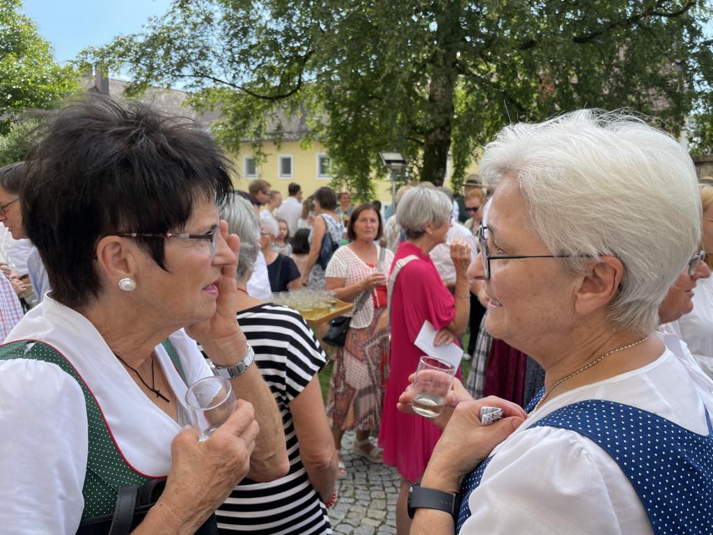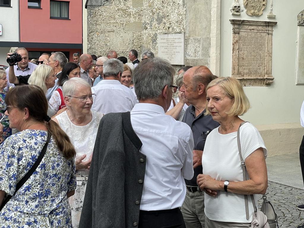 Nach dem Gottesdienst hatten noch alle vor der Kirche bei einer Agape Gelegenheit, auf Wiedersehen und Adieu zu sagen. Dazu kamen auch die Marktmusikkapelle, die Prangerschützen mit einem Ehrensalut, die Landjugend, Abordnungen der Goldhaubenfrauen, der Pensionist/-innen und der Feuerwehr und ganz viele Vöcklamarkter/-innen und Pfaffinger/-innen. Allen war es ein wirkliches Anliegen, dem verehrten Herrn Pfarrer Dank auszudrücken und für die Zukunft alles Gute zu wünschen.