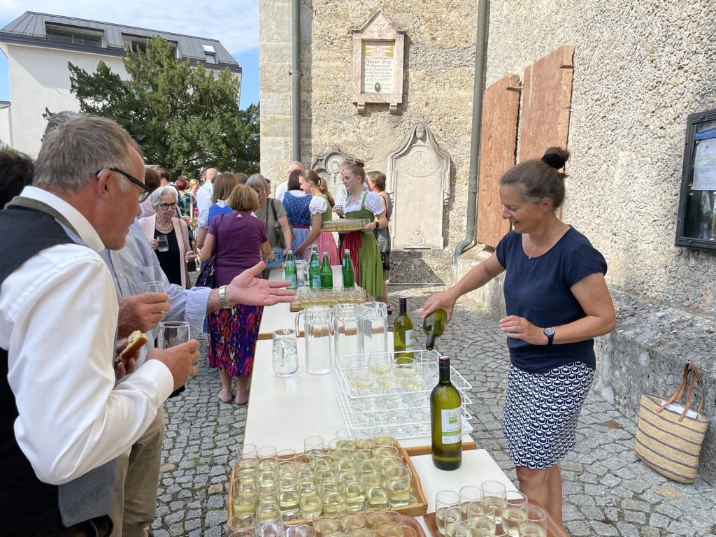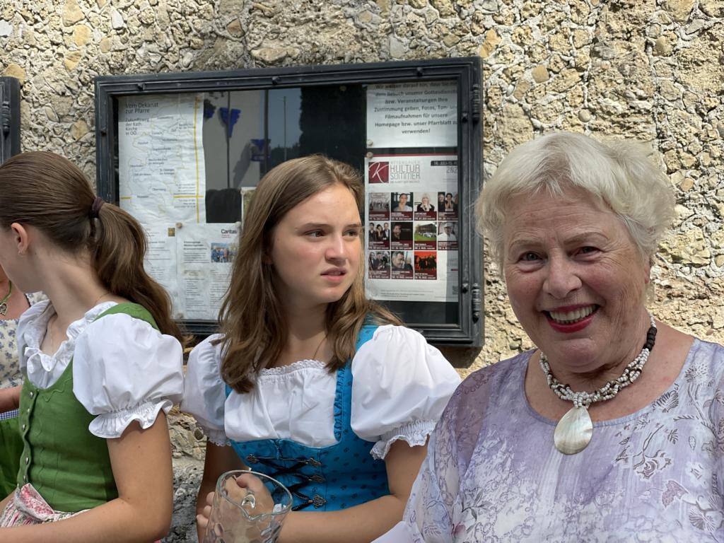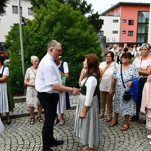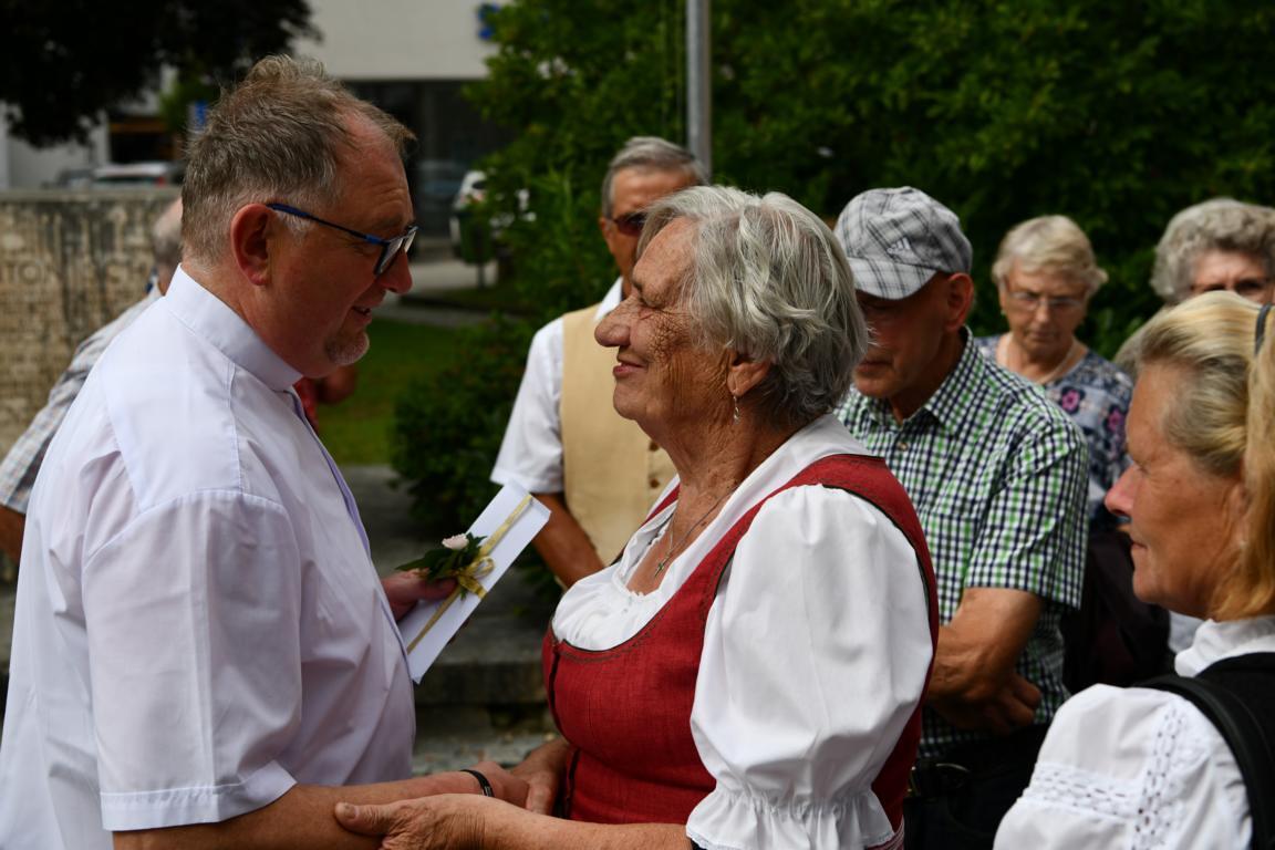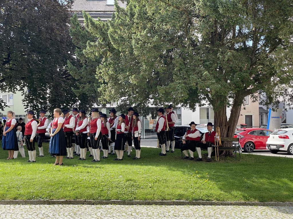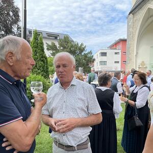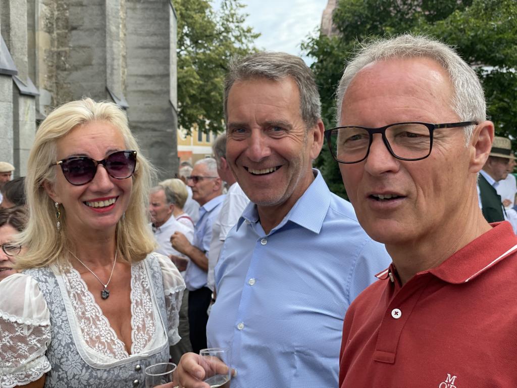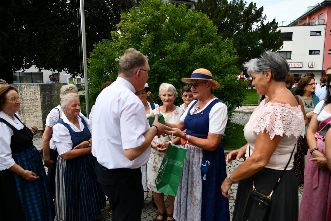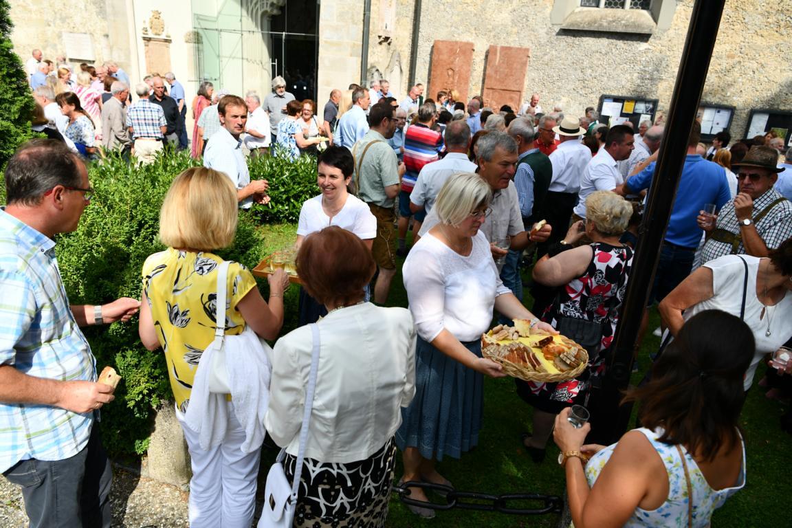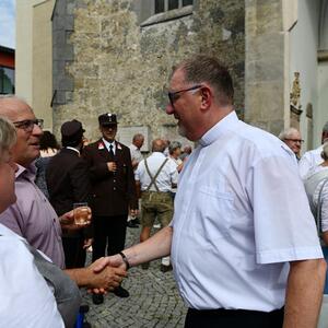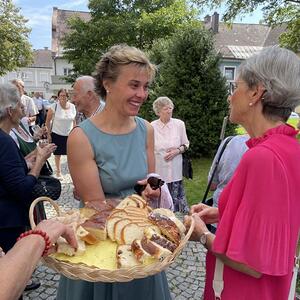Nach dem Gottesdienst hatten noch alle vor der Kirche bei einer Agape Gelegenheit, auf Wiedersehen und Adieu zu sagen. Dazu kamen auch die Marktmusikkapelle, die Prangerschützen mit einem Ehrensalut, die Landjugend, Abordnungen der Goldhaubenfrauen, der Pensionist/-innen und der Feuerwehr und ganz viele Vöcklamarkter/-innen und Pfaffinger/-innen. Allen war es ein wirkliches Anliegen, dem verehrten Herrn Pfarrer Dank auszudrücken und für die Zukunft alles Gute zu wünschen.