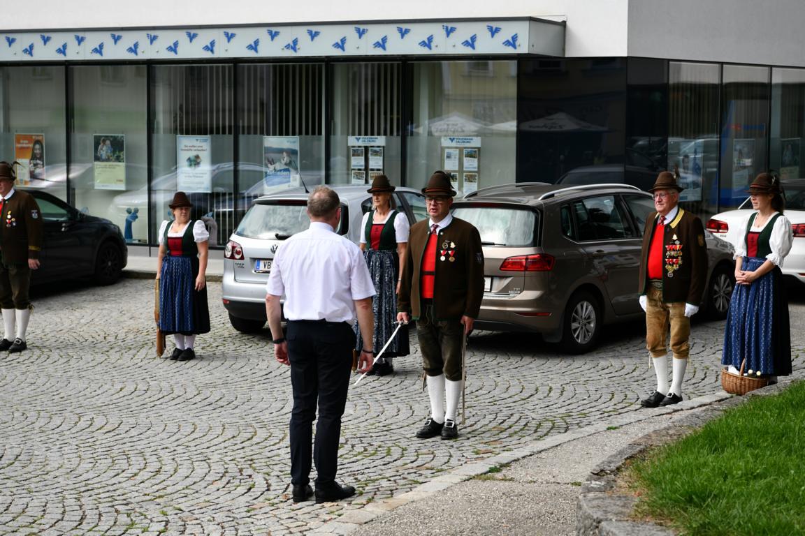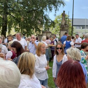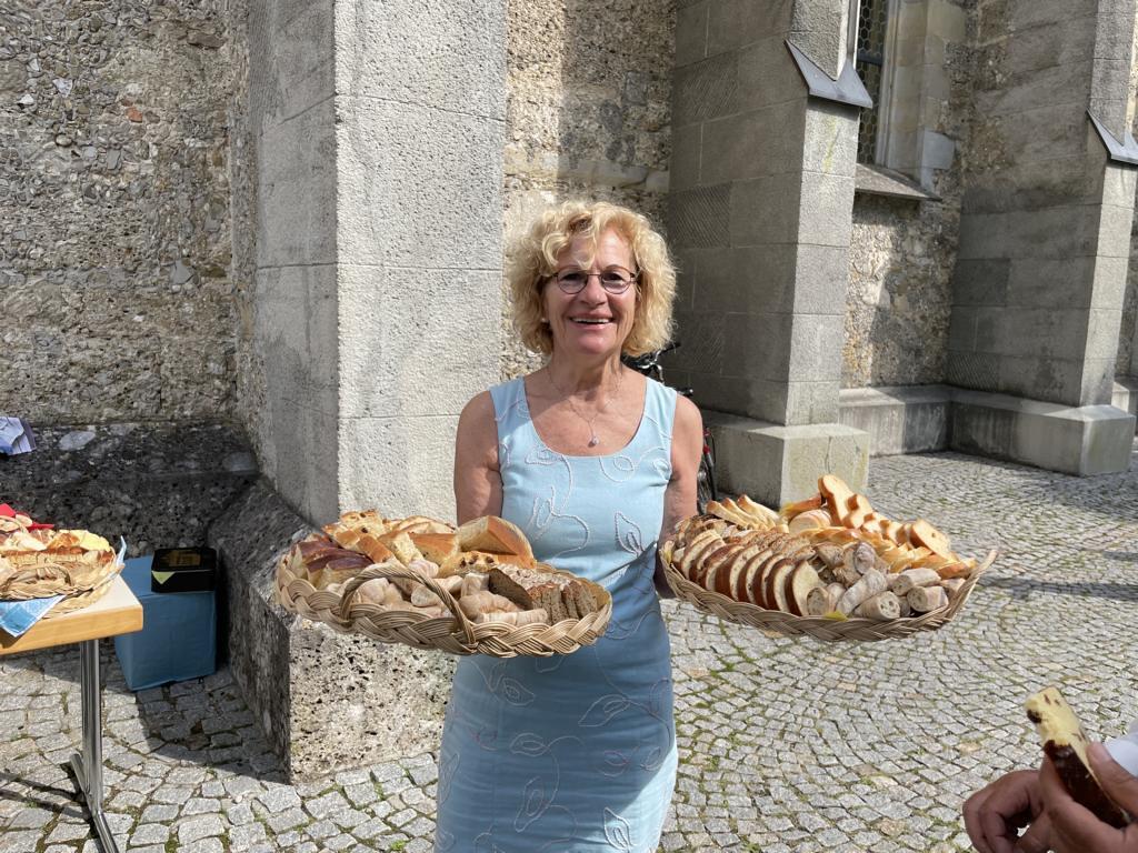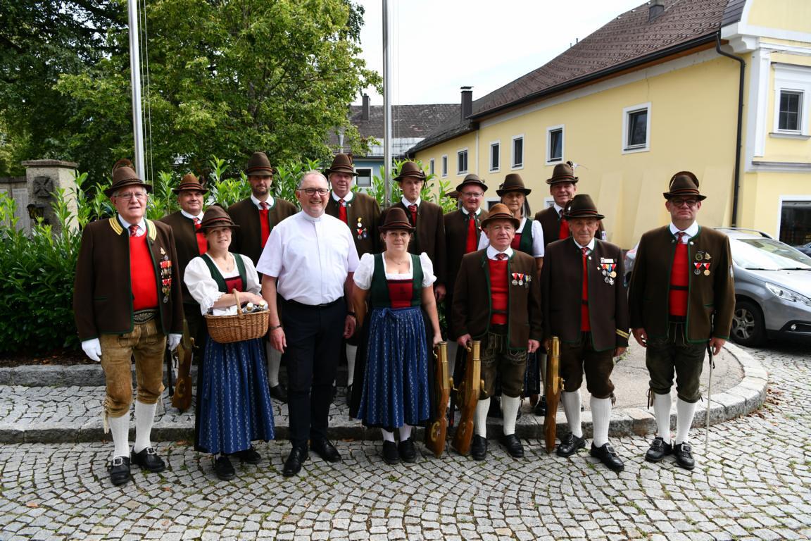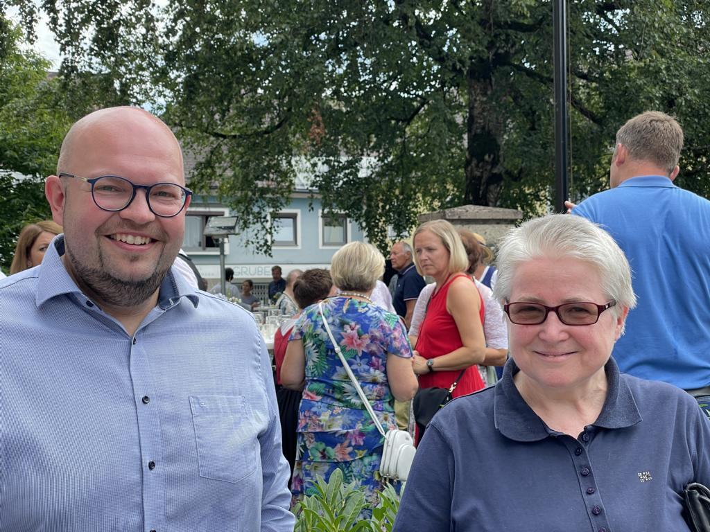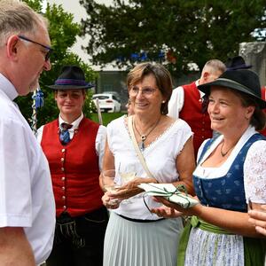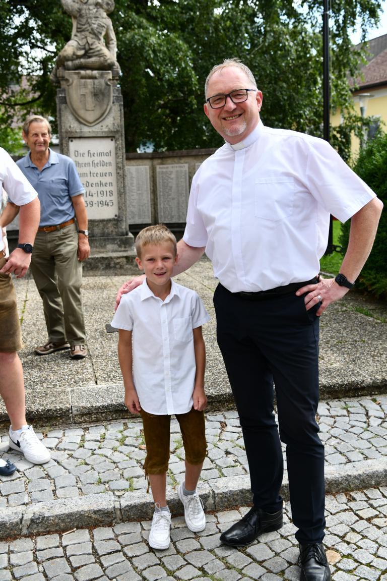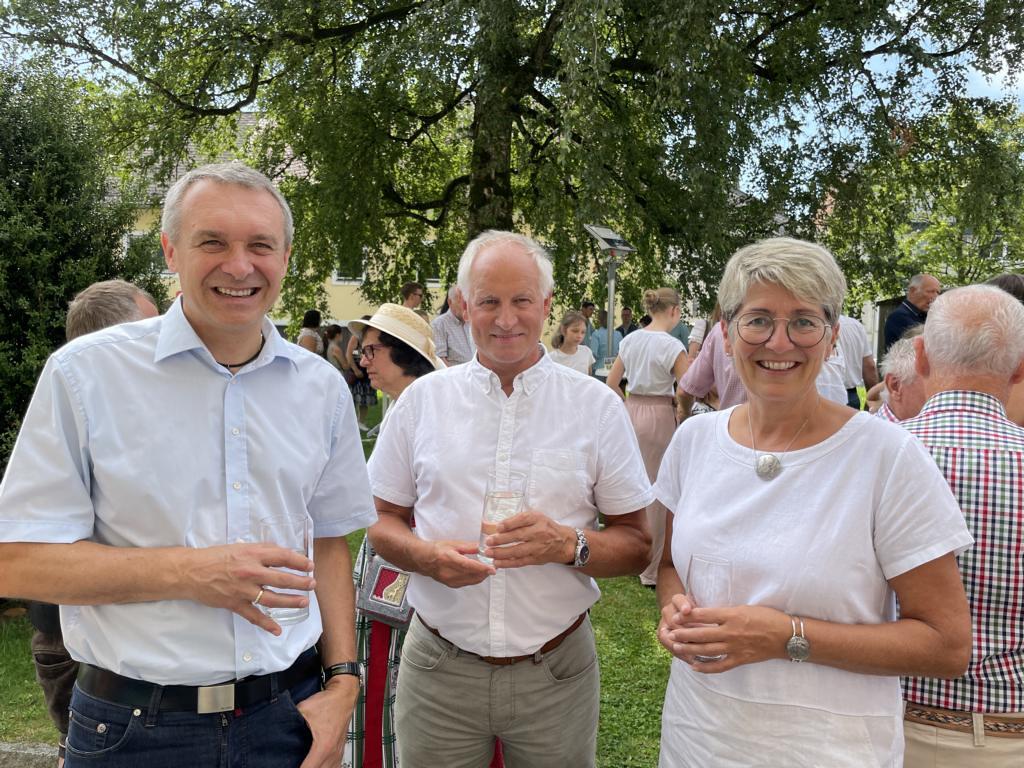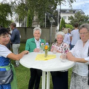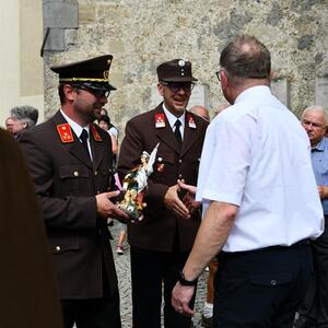 Nach dem Gottesdienst hatten noch alle vor der Kirche bei einer Agape Gelegenheit, auf Wiedersehen und Adieu zu sagen. Dazu kamen auch die Marktmusikkapelle, die Prangerschützen mit einem Ehrensalut, die Landjugend, Abordnungen der Goldhaubenfrauen, der Pensionist/-innen und der Feuerwehr und ganz viele Vöcklamarkter/-innen und Pfaffinger/-innen. Allen war es ein wirkliches Anliegen, dem verehrten Herrn Pfarrer Dank auszudrücken und für die Zukunft alles Gute zu wünschen.