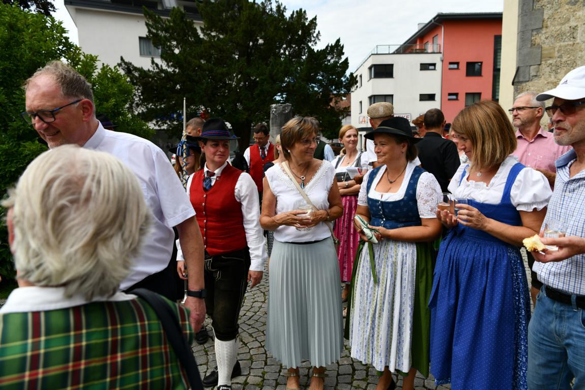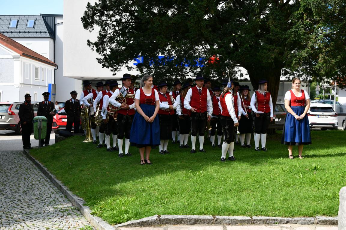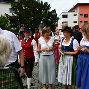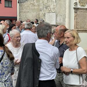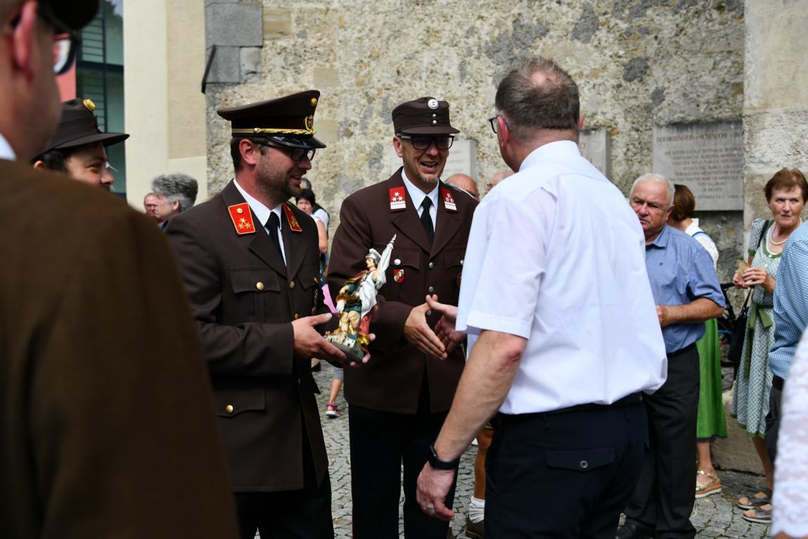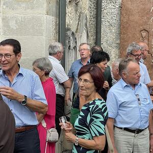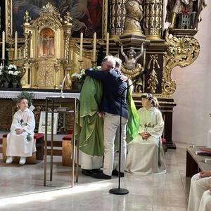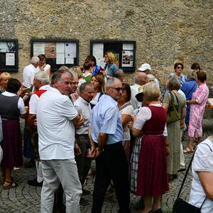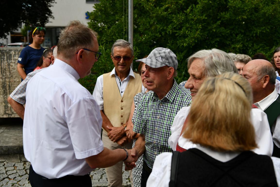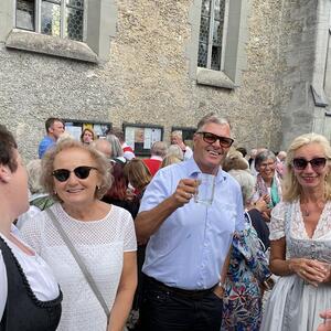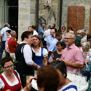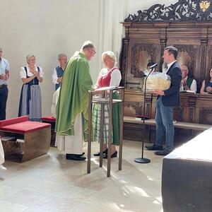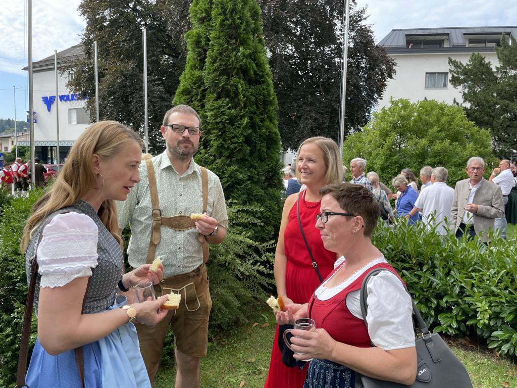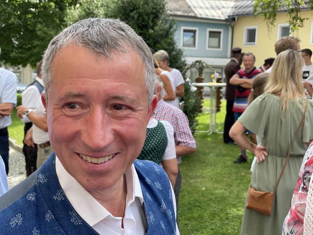 Nach dem Gottesdienst hatten noch alle vor der Kirche bei einer Agape Gelegenheit, auf Wiedersehen und Adieu zu sagen. Dazu kamen auch die Marktmusikkapelle, die Prangerschützen mit einem Ehrensalut, die Landjugend, Abordnungen der Goldhaubenfrauen, der Pensionist/-innen und der Feuerwehr und ganz viele Vöcklamarkter/-innen und Pfaffinger/-innen. Allen war es ein wirkliches Anliegen, dem verehrten Herrn Pfarrer Dank auszudrücken und für die Zukunft alles Gute zu wünschen.