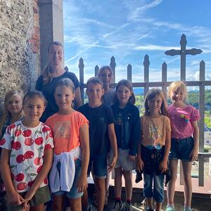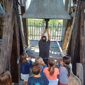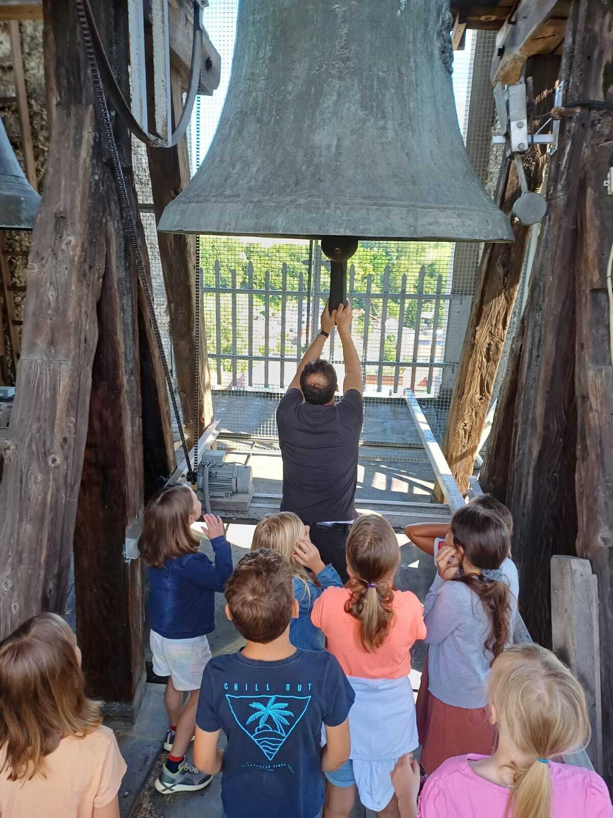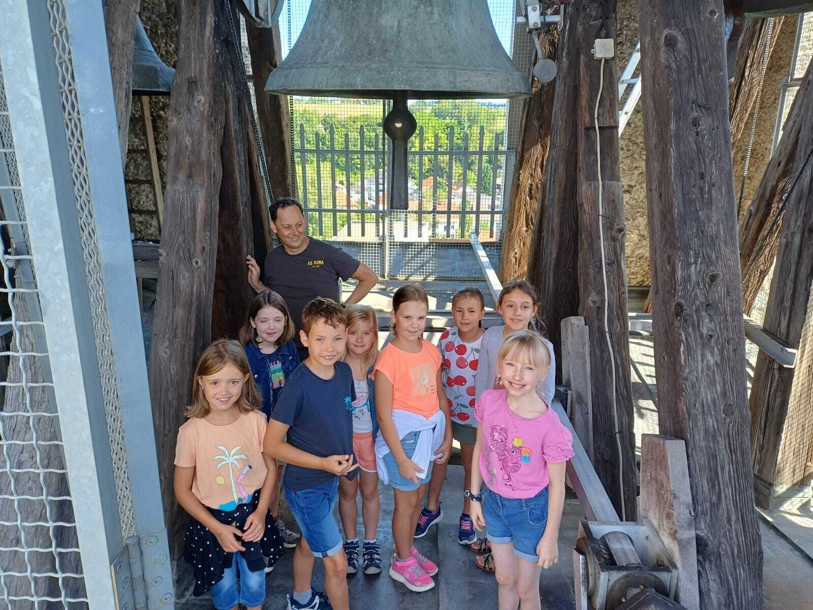 In der ersten gemeinsamen Stunde in den Sommerferien wurde der Kirchenturm erkundet. Besonders beeindruckt waren die Kinder neben der Aussicht von den fünf großen Kirchenglocken mit ihrem Klang, der auch am ganzen Körper spürbar ist. Nur die Turmfalken waren vom Besuch nicht so begeistert, hatten sie doch gerade eine Flugstunde mit ihrem Nachwuchs.