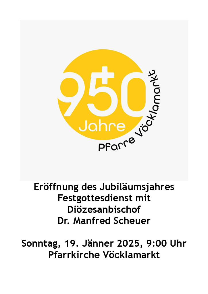 Die Pfarre Vöcklamarkt wurde im Jahr 1075 erstmals urkundlich genannt. Dieses 950 Jahr Jubiläum wollen wir ein ganzes Jahr lang feiern. Dazu wurde ein Programm zusammengestellt, das Sie hier runterladen können.