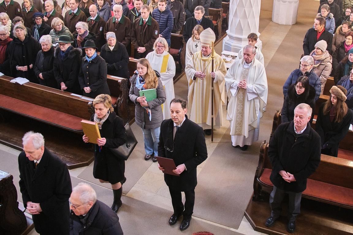 Am 19. Jänner eröffnete die Pfarrgemeinde das Jubiläumsjahr mit einem Festgottesdienst mit Diözesanbischof Dr. Manfred Scheuer. Mit ihm zogen Pfarrer Johann Greinegger, Seelsorgeverantwortliche Irmgard Raffetzeder, die liturgischen Dienste und eine großen Schar Ministrant/-innen in den vollbesetzten "Vöckla-Dom" ein. Es war eine Freude, dass so viele zum Auftakt dieses besonderen Jubiläums gekommen sind. Der Bischof gratulierte der ganzen Pfarre zu ihrem Alter: "Happy Birthday [...] - schön, dass Du da bist".