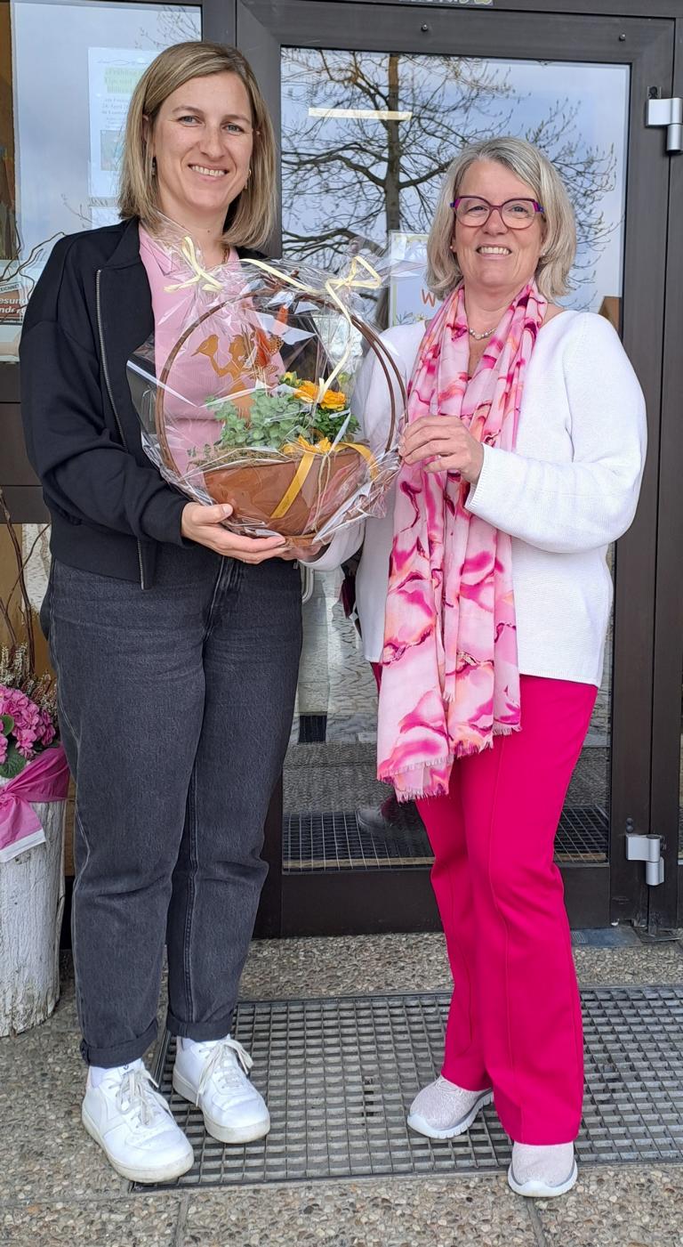 Seelsorgeverantwortliche Irmi Raffetzeder überreichte zum Abschied einen Blumenstrauß und dankte im Namen der Pfarre der scheidenden Leiterin für ihre großartige und zuverlässige Arbeit im Kindergarten.