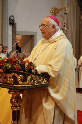 In seiner Ansprache wies der Bischof darauf hin, dass Dankbarkeit nicht selbstverständlich sei. Auch von den 10 geheilten Aussätzigen kam nur einer zurück, um zu danken. Aber es sei gut und wichtig danke zu sagen „für die Ernte dieses Jahres, für alles, was wir haben, für unser Leben und für dieses Gotteshaus.“ Trotz Wetterunbilden und Krisen dürfen wir uns über eine „lebenssichere Ernte“ freuen, bei der wir „Mitschöpfer“ sind. Letztlich ist das Gelingen aber ein Geschenk Gottes an uns. Danken sollten wir nicht nur für Speis und Trank, sondern auch für viele andere Dinge, die das Leben angenehm und schön machen. Dazu gehört ebenso das geschwisterliche Miteinander, denn alle sind auf andere und deren Arbeit angewiesen, damit wir in Ordnung und Sicherheit leben können. „Schätzen wir die gute Ernte, halten wir Maß, sind wir bereit zu teilen …!“