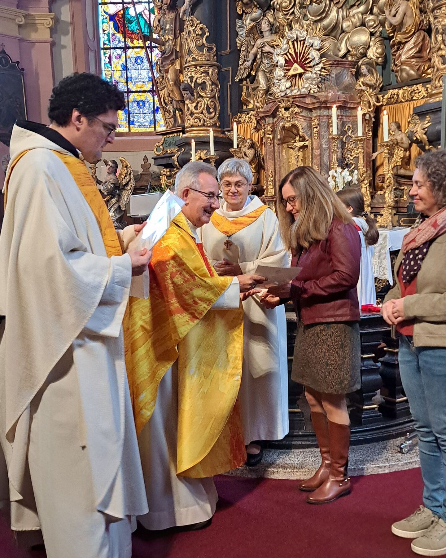 Auch Abt Ambros ermutigte die Beauftragten und alle Mitfeiernden, für das Wort und den Auftrag Gottes in unserer Zeit offen zu sein. Er zog eine Parallele zu den beiden Brunnen am Petersplatz, die gewissermaßen drei Schalen übereinander sind, die sich aus der selben Quelle speisen. Er führte aus: „Die eine Schale nährt sich aus der Anderen. Die Erste ist die Kontemplation, dass ich persönlich Kraft aus dem Gebet schöpfe. Die zweite Schale ist die Gemeinschaft, dass wir miteinander den Glauben leben. Die dritte Schale ist die Caritas, die Sorge um die Schwächeren.“ So ermutigte Abt Ambros, sich in der Gemeinde der Glaubenden einzubringen und selbst immer wieder zur Quelle zu kommen. Gestärkt durch die Feier, aber auch durch eine kleine Agape kann nun unser Seelsorgeteam seine Arbeit aufnehmen und wir alle sollen als Gemeinde mithelfen, das Wort Gottes in die Tat umzusetzen, denn wir alle sind „Seelsorger“: