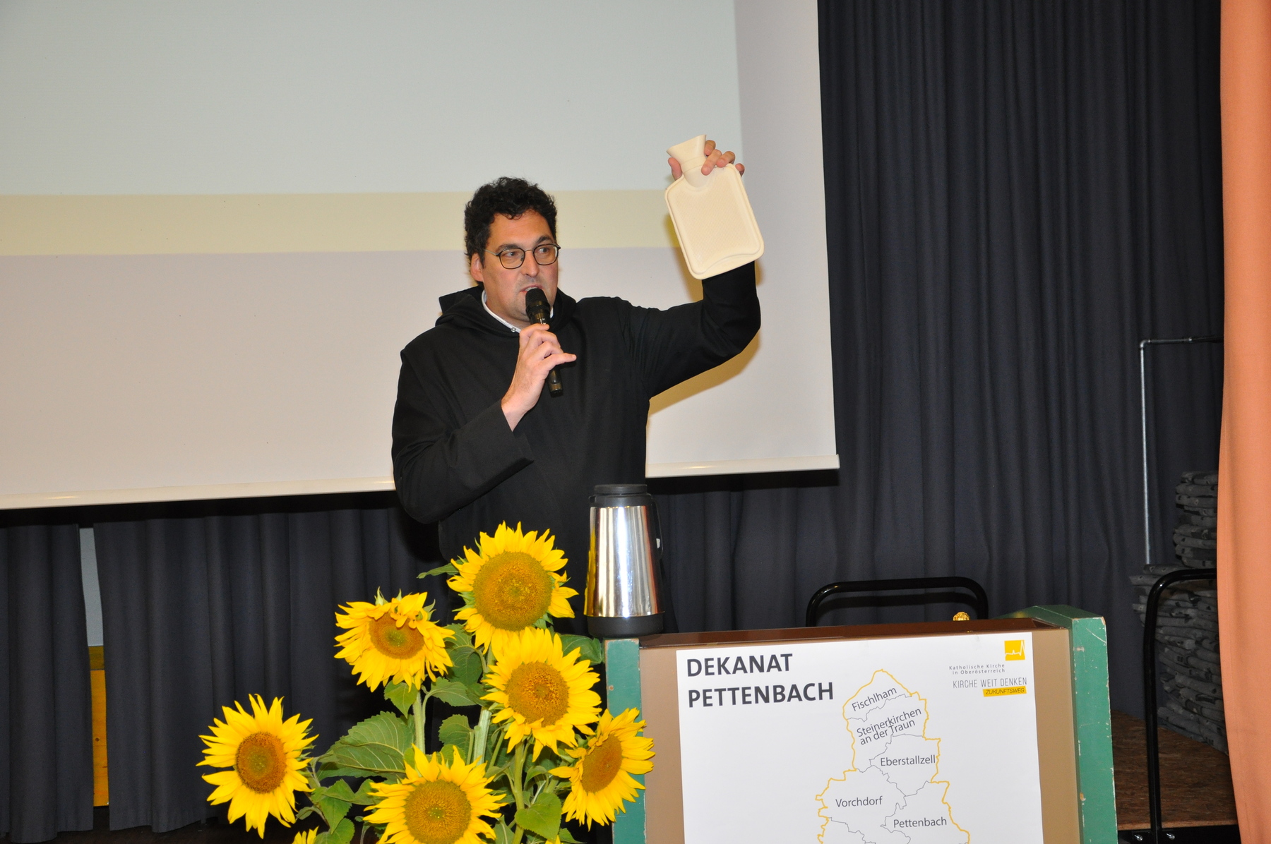 Dechant P. Franz Ackerl begrüßte am Beginn der Startveranstaltung alle ehrenamtlich Engagierten und Interessierten aus den 11 Pfarren des Dekanates sowie diözesane Vertreter:innen und Prozessbegleiter:innen. In seinem spirituellen Impuls nahm Ackerl Bezug auf den Theologen Karl Rahner, der in seinen letzten Lebensjahren von einer winterlichen Kirche gesprochen hatte – eine Kirche wie eine Thermoskanne. Die Kirche solle aber keine Thermoskanne sein, so Ackerl. Diese halte nur warm, was schon in ihr drinnen ist. „Wir sollen eher eine Wärmeflasche sein, die Wärme ausstrahlt“, so Ackerl.