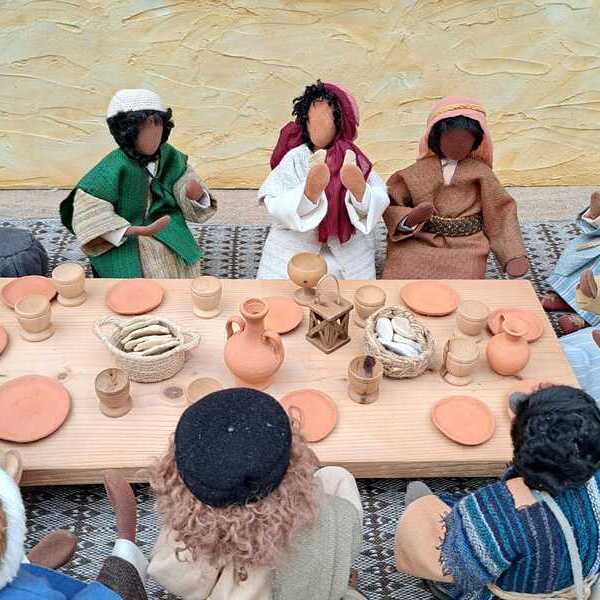 Bildeindruck der Passions- und Osterausstellung mit biblischen Erzählfiguren: 'Jesus feiert mit seine Freind des letzte Abendmahl'