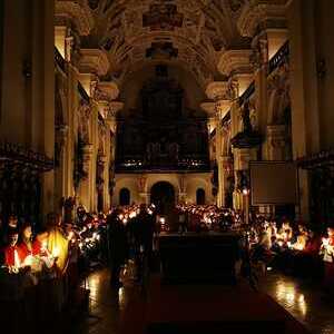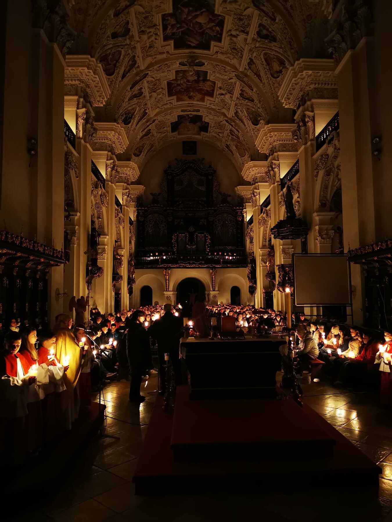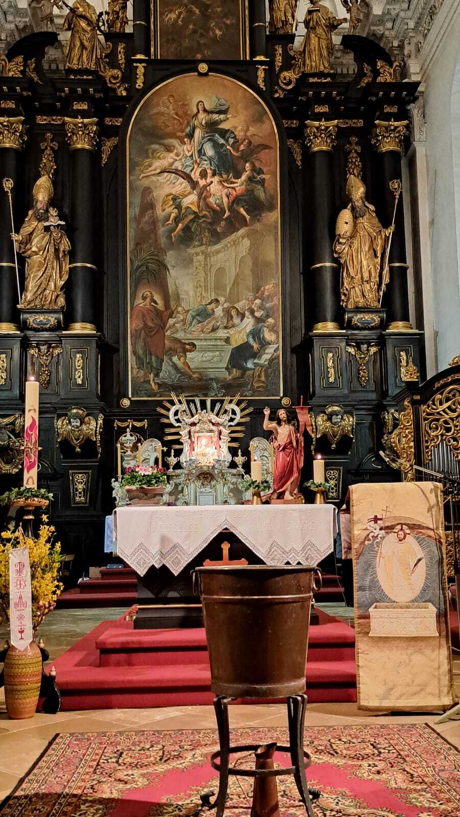 Die Firm-Anwärter feierten die Osternacht mit und verteilten das Osterfeuer unter den Gottesdienstbesuchern der Stiftskirche. Im Anschluss wurde der Osternachts-Gottesdienst mit Lesungen, Taufwasserweihe, Erneuerung des Taufversprechens und Speisenweihe gefeiert.