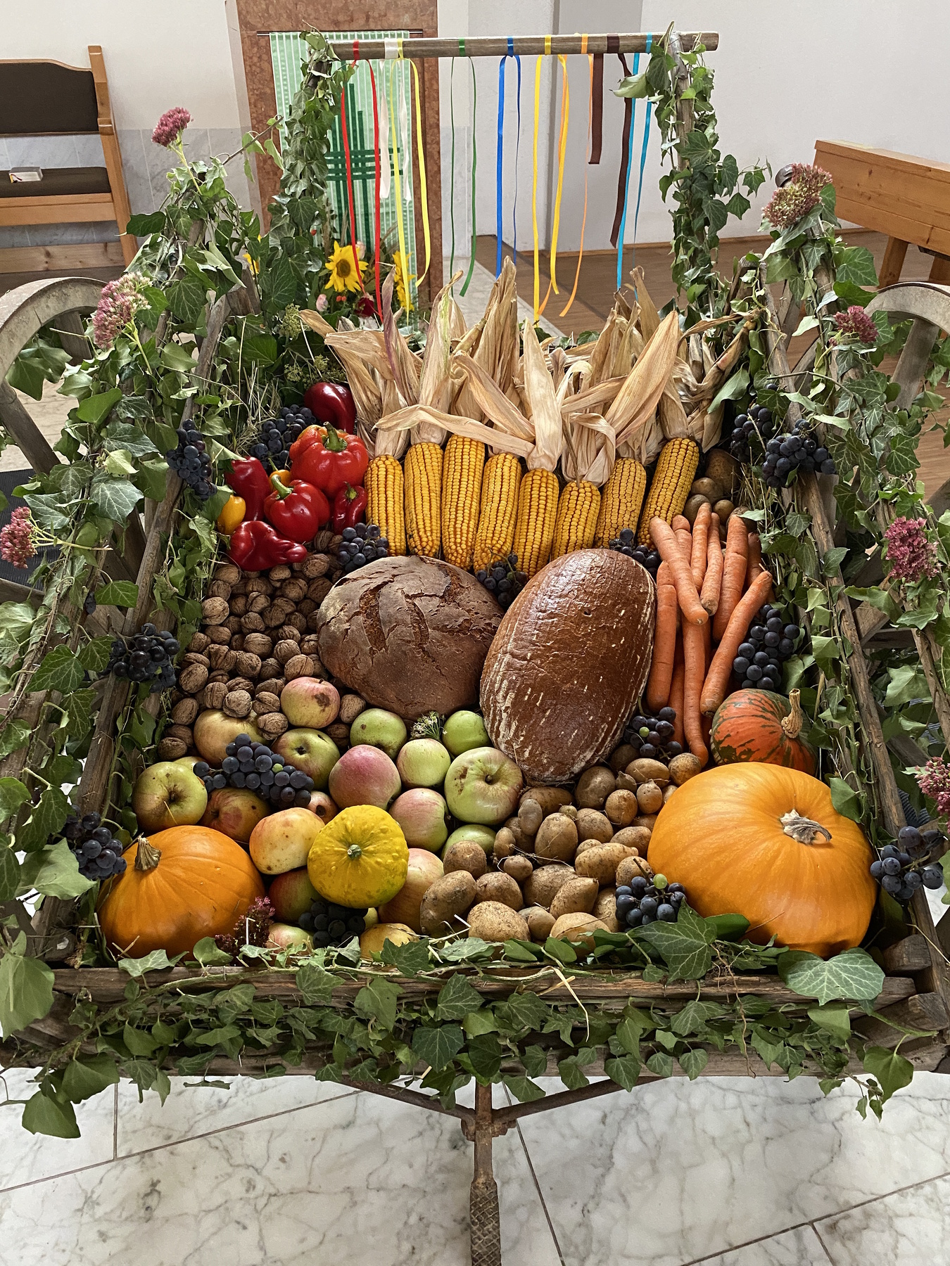 Danke an die Landjugend für die schön gestaltete Erntekrone und den Erntewagen, dem Kirchenchor und der Ortsmusik Walding für die musikalische Umrahmung und dem Verein Landleben und der Landjugend für die Agape.