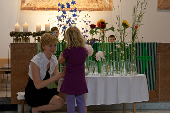 Der Gottesdienst wurde musikalisch gestaltet vom Kinderliturgie Chor (mit Unterstützung der Eltern) unter der Leitung von Susanne Bumberger. Nach dem Gottesdienst verteilten die Goldhaubenmädchen Kekse im Blumenform an alle Väter.