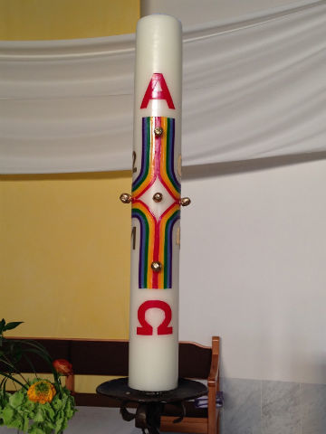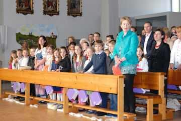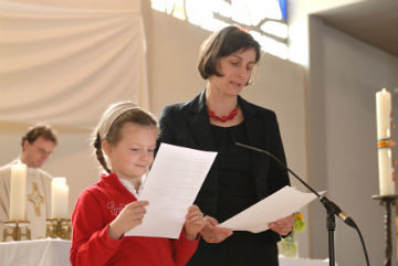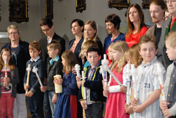 Die Kinder feierten mit Begeisterung und mit allen Sinnen mit, machten Gesten zu den Liedern und lasen die vorbereiteten Texte, tw. gemeinsam mit den Eltern. Gemeinsam mit den Paten wurde das Taufversprechen erneuert und die Taufkerzen wurden an der Osterkerze entzündet. Die musikalische Gestaltung wurde vom Religionslehrer und von Eltern und Geschwister der Erstkommunionkinder übernommen.