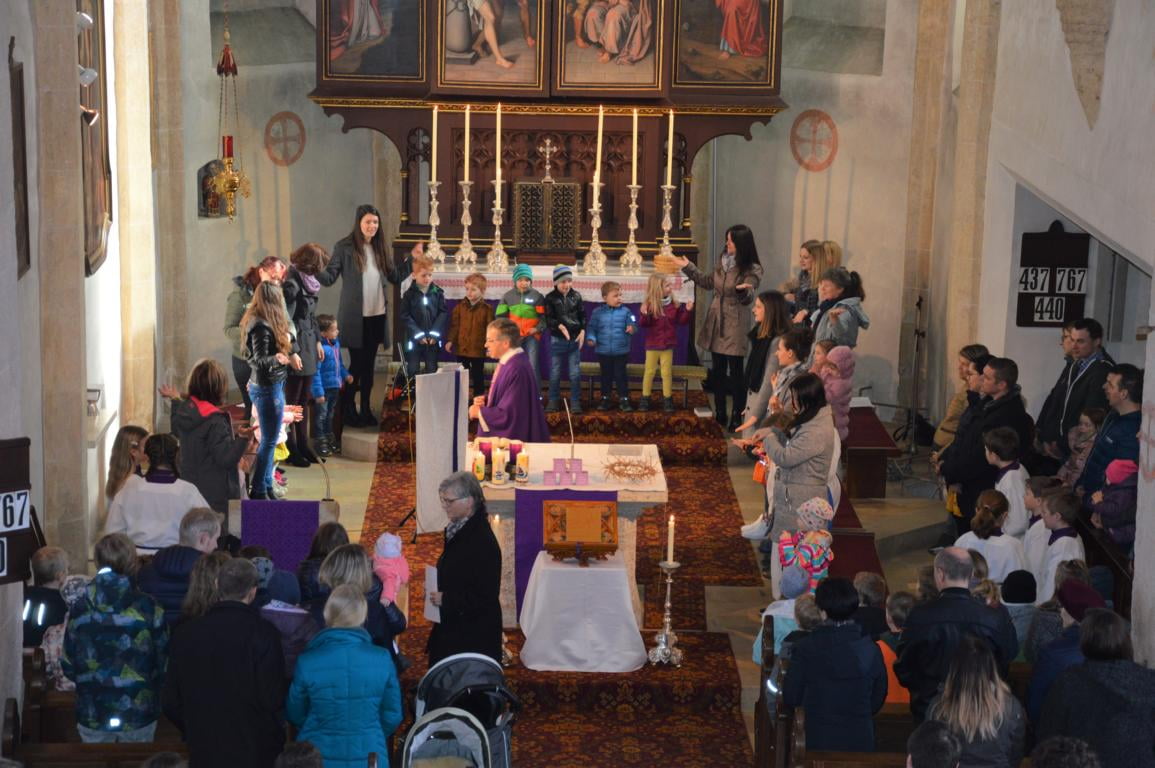 Die Kinder des Kindergartens mit den Pädagoginnen saßen rund um den Altar und gestalteten den Gottesdienst mit.
