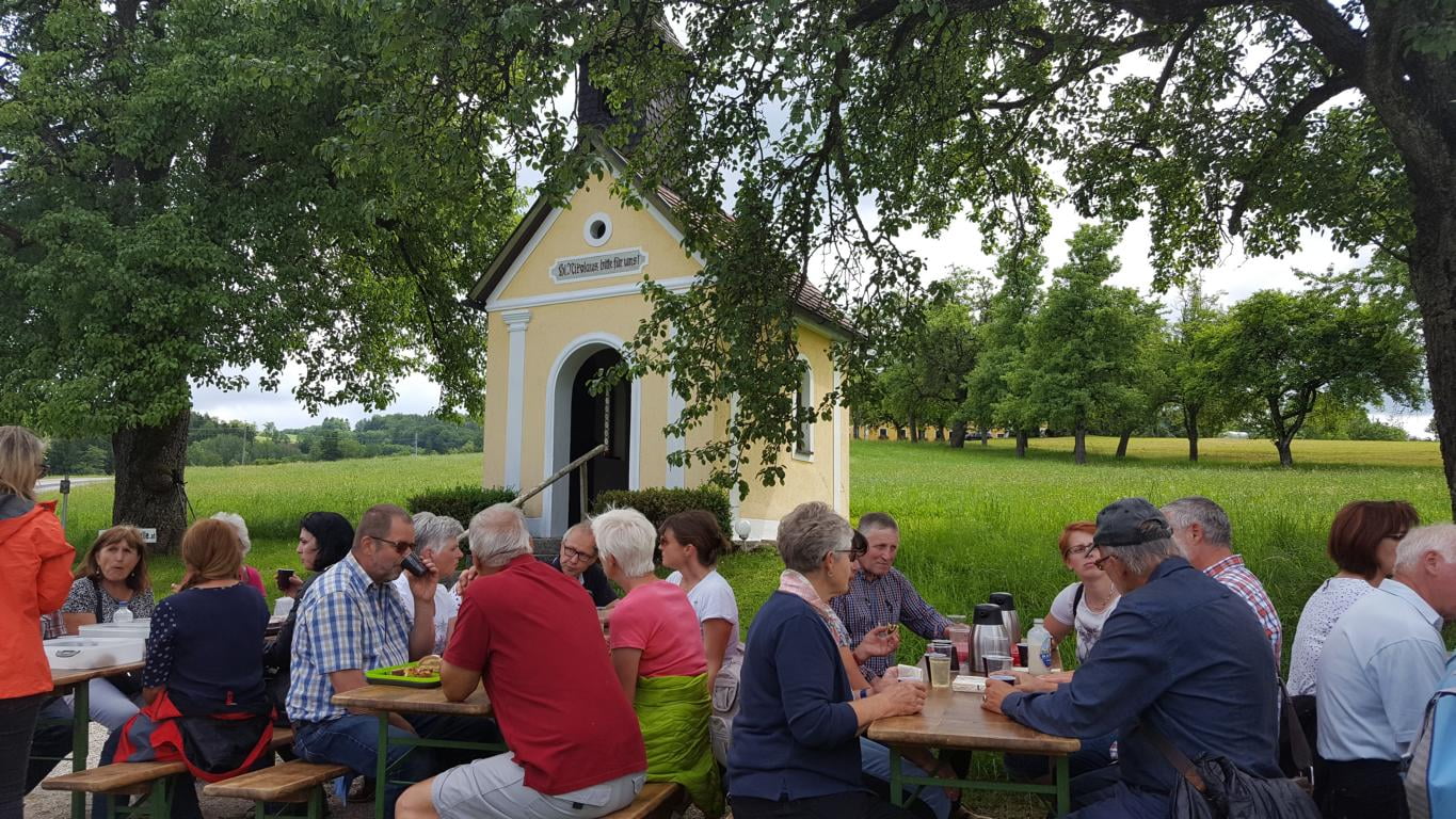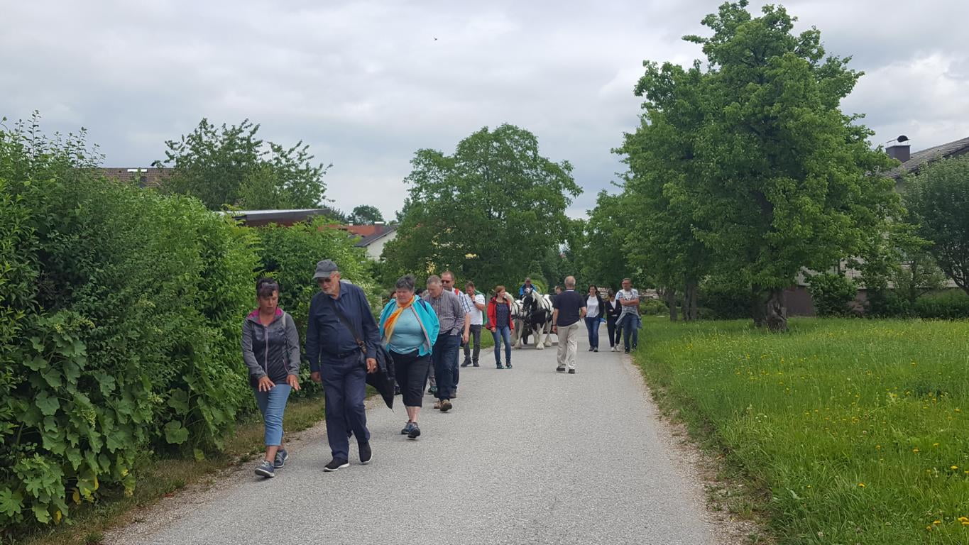 Zuerst ging es zur Stummer-Kapelle (Hallerwald-Kapelle) aus der Zeit von 1895. Dann auf den Waldlehrpfad in den Hallerwald. Wem das Gehen zu anstrengend war, der konnte mit Bernhard auf der Kutsche fahren. Im Gemeindegebiet Adlwang, einst "Altpfarre Waldneukirchen" kamen wir zur "P. Pio-Kapelle" beim Dichtl (neu: 2013), wo uns der Senior vieles erklärte. Es ging zum Bomair-Kreuz (1908) und zum Stallinger-Kreuz (vermutlich 1753) auf dem neuen Weg des "Waldbadens" hinüber zur Nikolauskapelle (1987) und der uralten Kultstein "Die Hand". Dort gab es eine gemütliche Kaffeejause zur Stärkung, bevor der steile Rückweg zum Hallerwald angetreten wurde. Mit einer kleinen Jause endete die Marterlroas, an der rund 50 Personen teilnahmen.