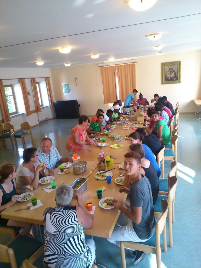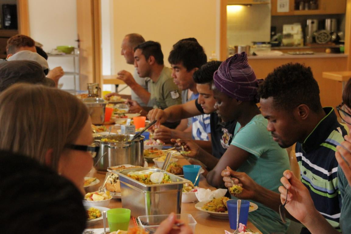 Zum gemeinsamen Kochen am Samstag Nachmittag sind alle willkommen. Der Kontakt mit den Menschen aus Nigeria, Afghanistan, Syrien und Kosovo gelingt bei dieser Gelegenheit sehr leicht und das gegenseitige Kennenlernen ist einfach.