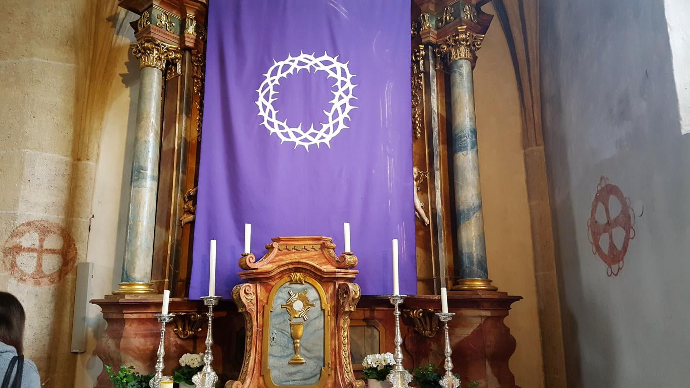 Die Altäre sind seit dem Passionssonntag mit Fastentüchern verhängt. Hier der Marienaltar, wo am Gründonnerstag das Allerheiligste im barocken Tabernakel gebracht wurde.