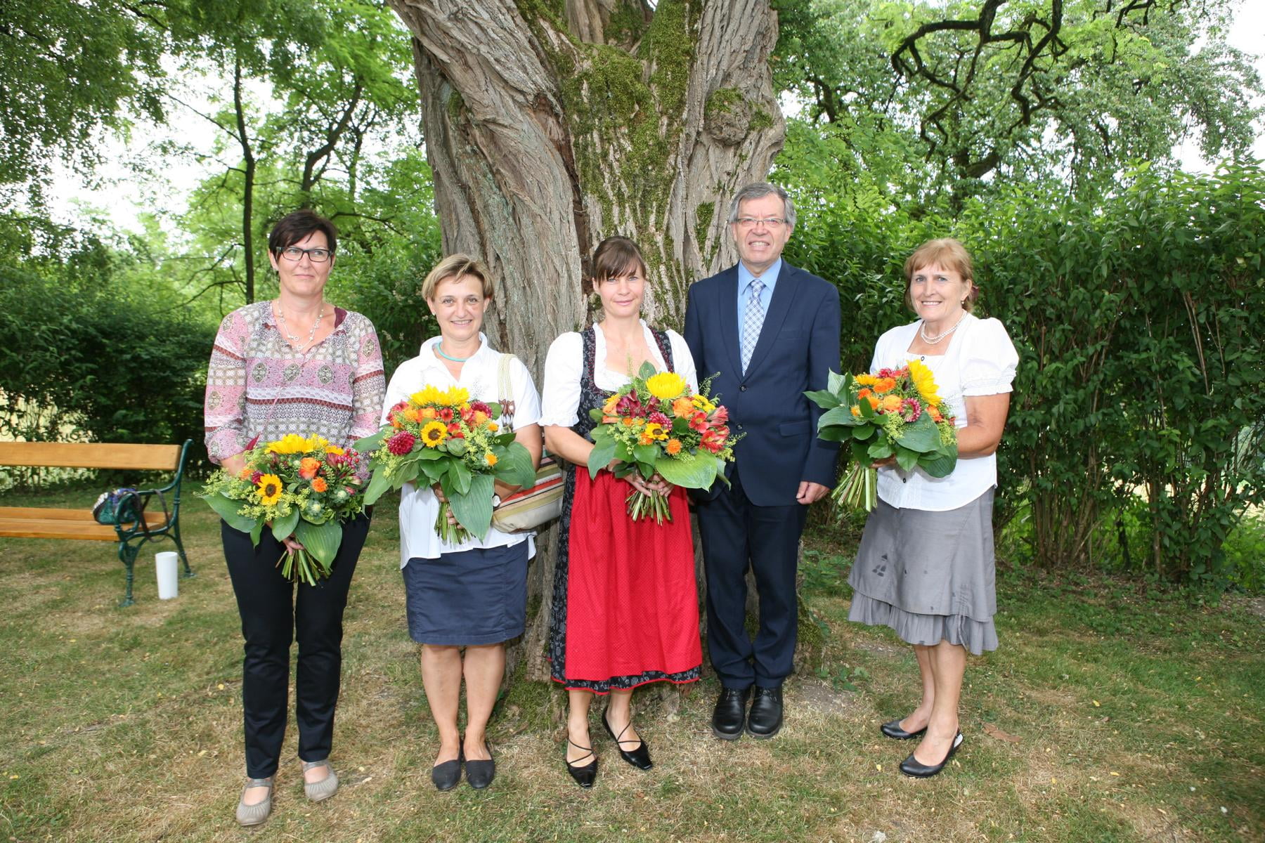Das neue Team der Leitung des Pfarrgemeinderates mit Franziksa Eder, Hermine Diwald, Christine Wenzl, Dechant Pfarrer Mag. Alois Hofmann und rechts mit der früheren Obfrau Marianne Damböck.