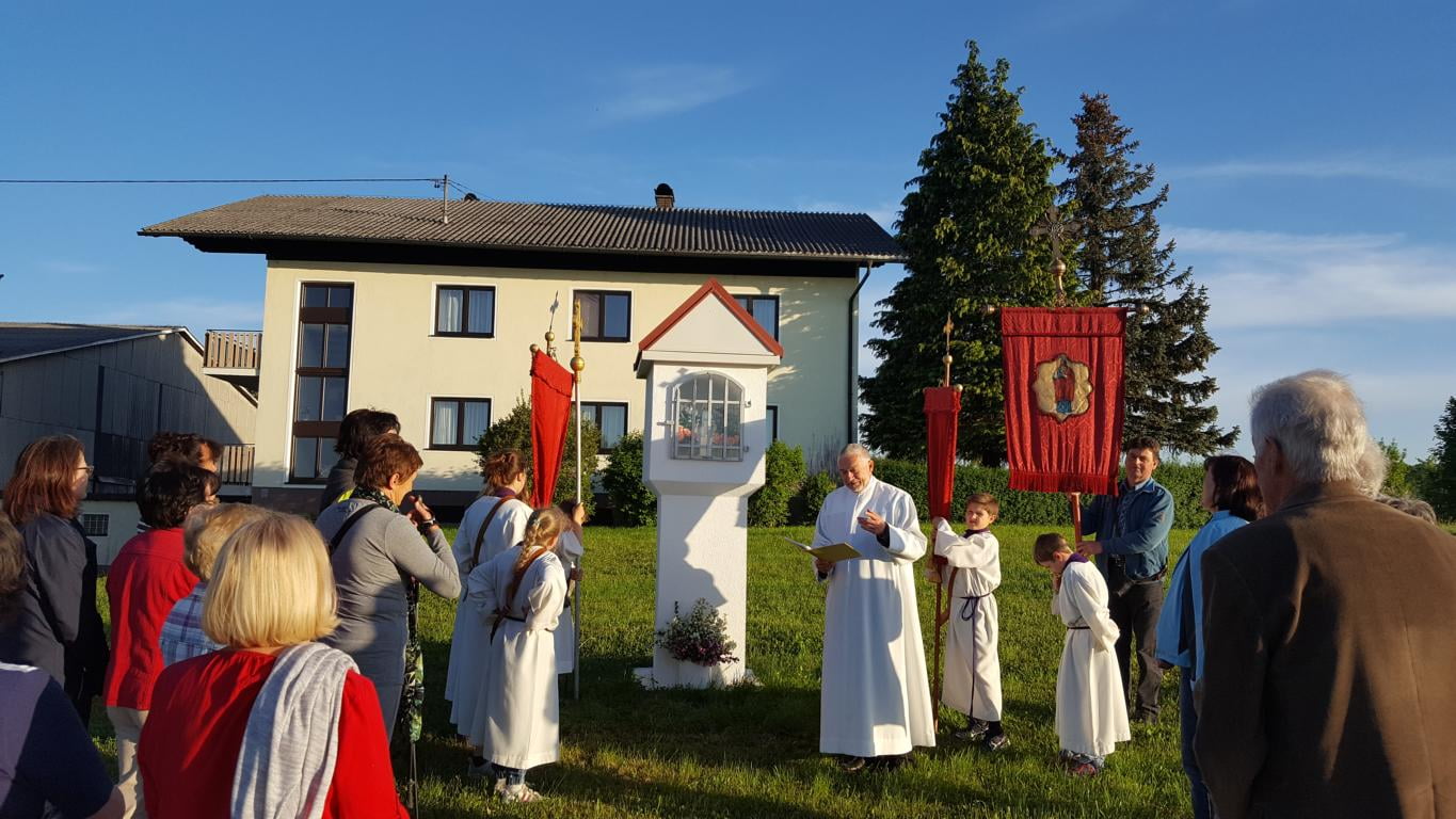 Im Rahmen der Bittprozession am Montag, 7. Mai 2018 fand die Segnung des Bildstockes beim Bauernhof "Bischof" - Familie Schörkhuber - statt. Gottesdienstleiter Ernest Ulbrich leitete die Prozession und die Segnung