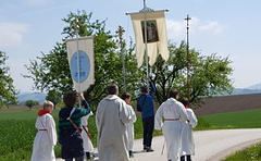 Wallfahrt nach Adlwang am 1. Mai 2019: bei schönem, kühlem Wetter ging es um 7.30 Uhr los; kurze Andachten gab beim "Gömann-Kreuz" und beim "Renold-Kreuz". Die Kinderliturgiegruppe Feliggs war wieder mit der neuen Fahne und Liedern dabei