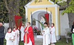 Palmsonntag, 14. April 2019 in Waldneukirchen, begann mit der Palmweihe bei der Marienkapelle. Dechant und Pfarrer Alois Hofmann segnete die vielen Palmbuschen, besonders freute man sich über den eindrucksvollen Gesang der Kindergartenkinder.