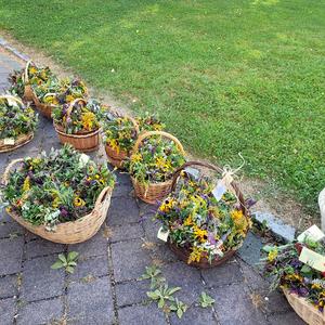 "Lasset uns beten! Herr, unser Gott, Du hast Maria über alle Geschöpfe erhoben und sie in den Himmel aufgenommen mit Seele und Leib. An ihrem Hochfest danken wir Dir für alle Wunder Deiner Schöpfung. Durch die Heilkräuter und Blumen schenkst Du uns Gesundheit und Freude. Segne + diese Kräuter und Blumen. Sie erinnern uns an Deine Herrlichkeit und an den Reichtum Deines Lebens. Schenke uns auf die Fürsprache Mariens Dein Heil. Laß uns zur ewigen Gemeinschaft mir Dir gelangen und dereinst einstimmen in das Lob der ganzen Schöpfung, die Dich preist durch Deinen Sohn Jesus Christus in alle Ewigkeit.“