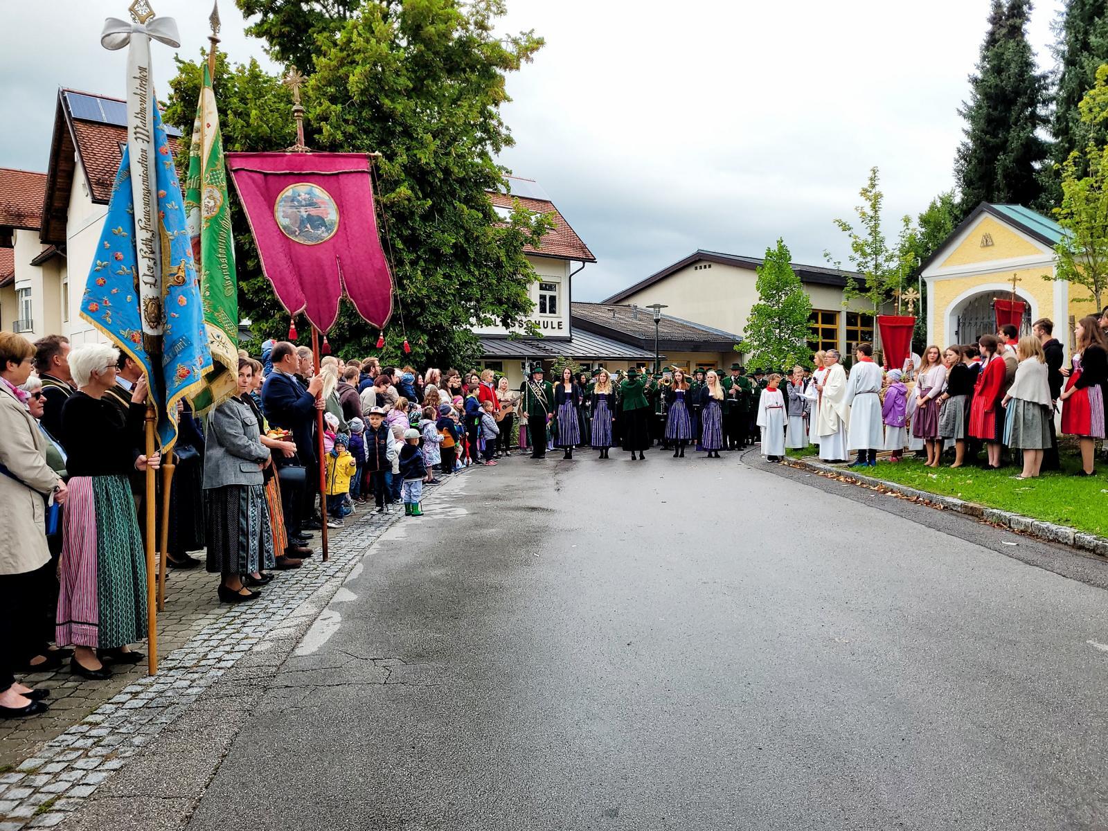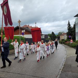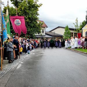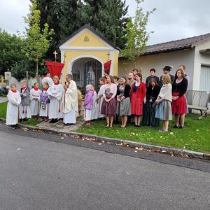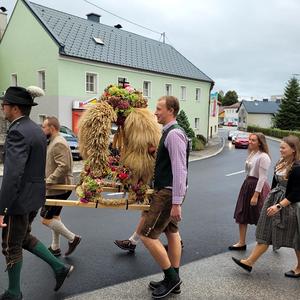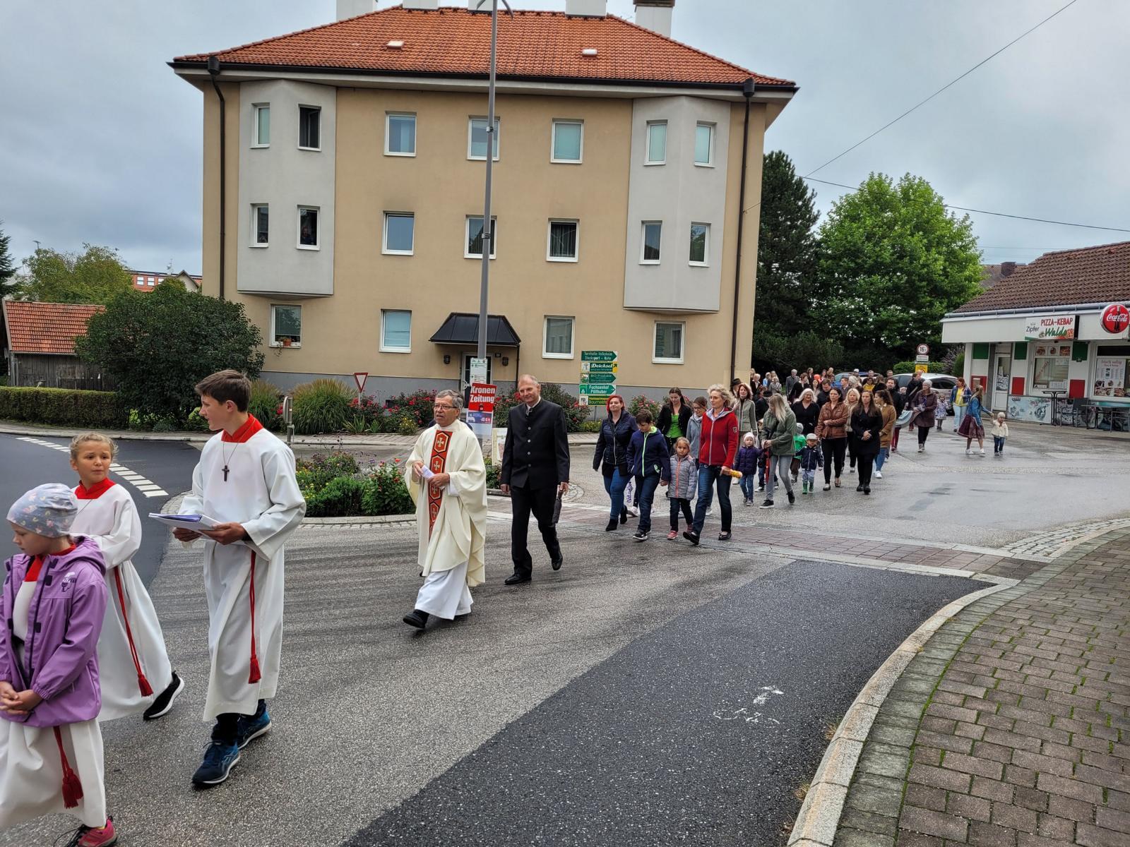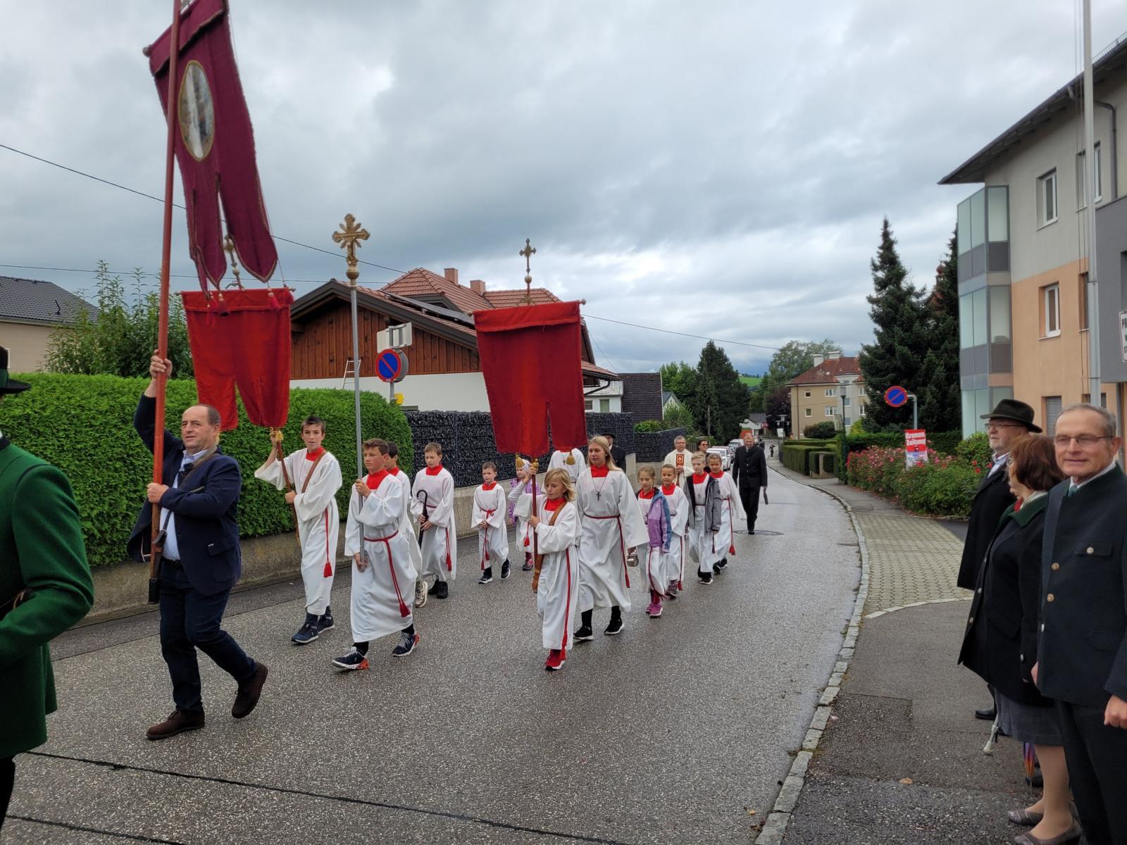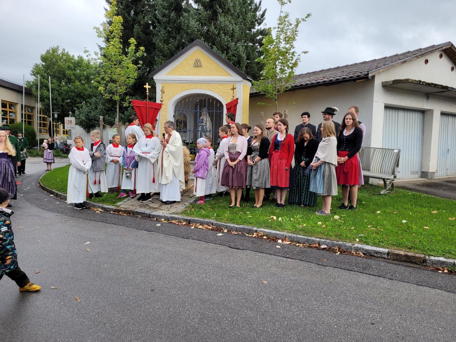 Anschließend ging die Prozession zur Pfarrkirche und es begann zu regnen. Pfarrer Hofmann führte in seiner Ansprache die vielfältigen Probleme der Welt im Zeichen des Klimawandels und der ausbleibenden Ernte an. Der Kirtag am Dorfplatz fand unter Schirmen statt. Die Pfarre präsentierte sich mit einem Stand mit Kuchen, Socken, Schürzen etc. für das Sozialprojekt "Marys Meals".