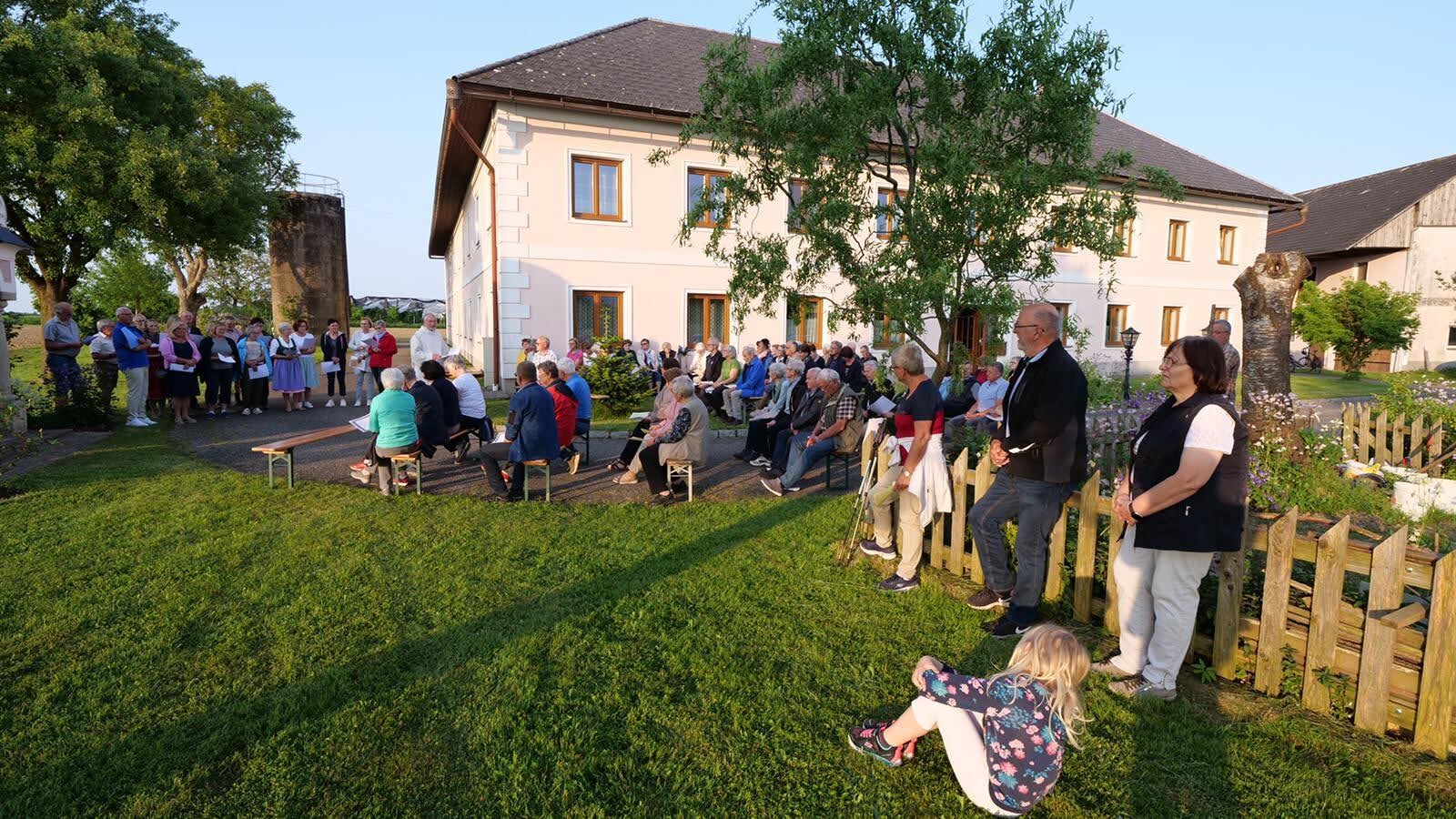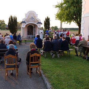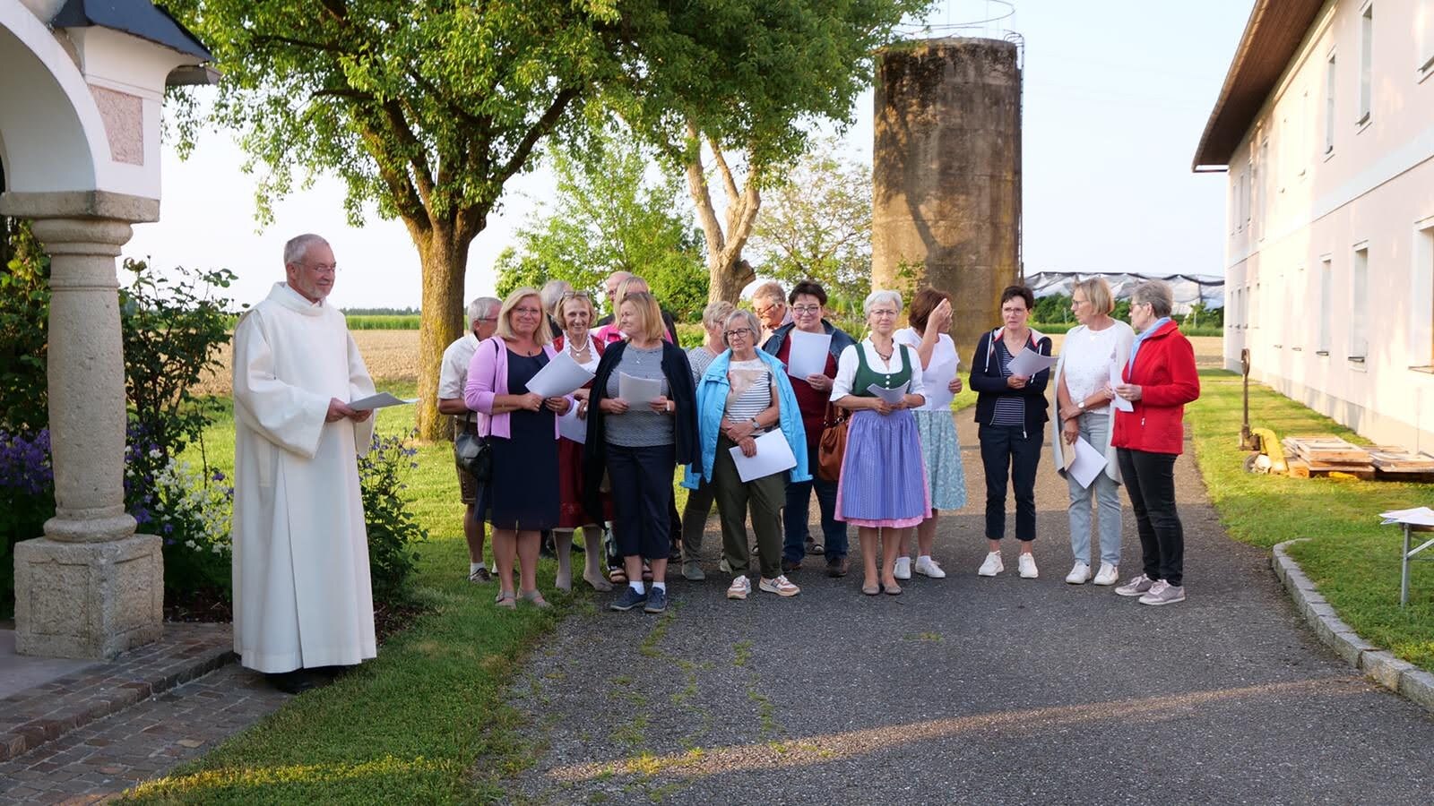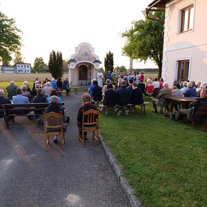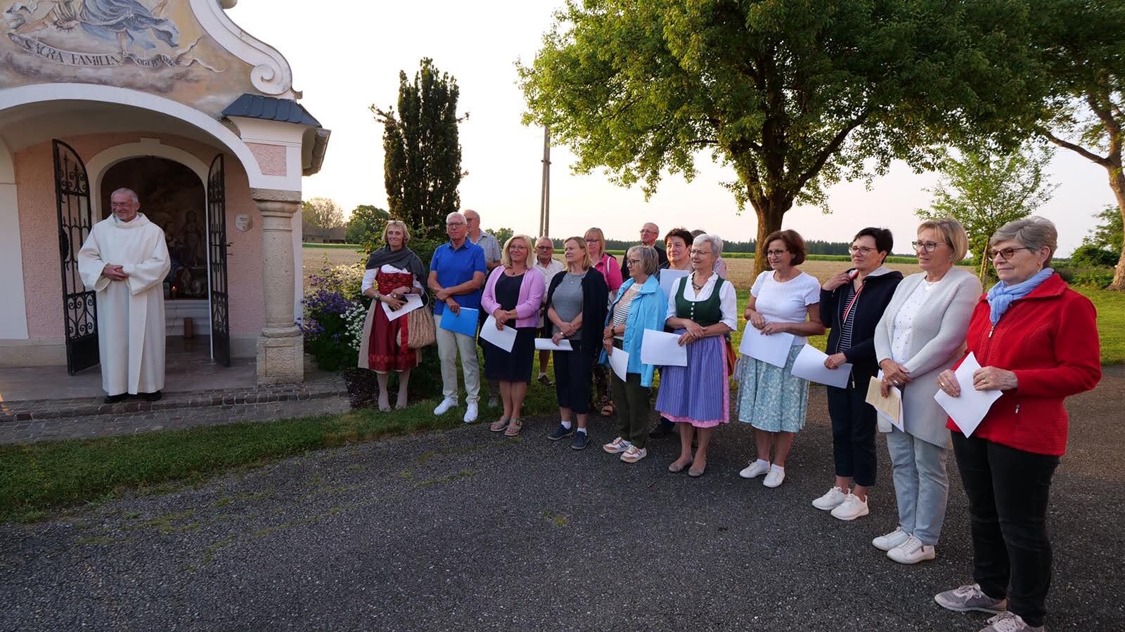 Die Marienlieder "Wunderschön Prächtige" und "Wir ziehen zur Mutter der Gnade" wurden gemeinsam und sehr kräftig gesungen. Schöne Chorsätze von "Sancta Maria" und "Gegrüßt seist Du Maria" gaben der Feier einen stimmungsvollen Rahmen. Im Anschluss an die Maiandacht lud Familie Ganglbauer zu einem Umtrunk ein.