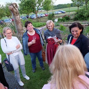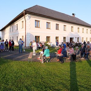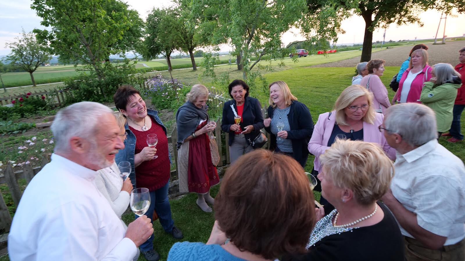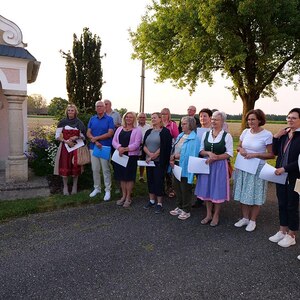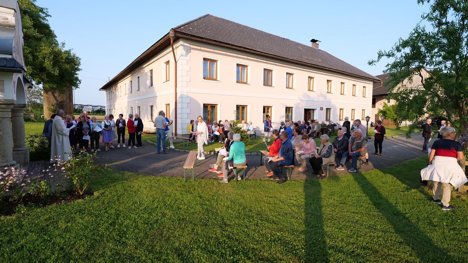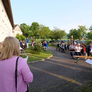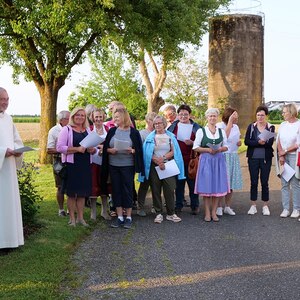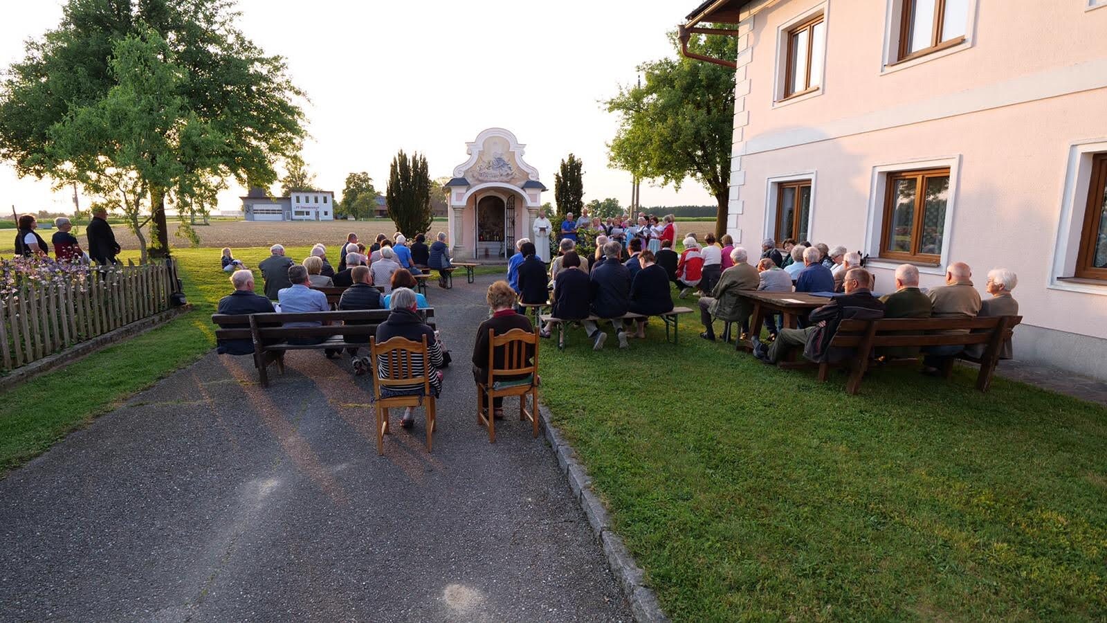 Die Marienlieder "Wunderschön Prächtige" und "Wir ziehen zur Mutter der Gnade" wurden gemeinsam und sehr kräftig gesungen. Schöne Chorsätze von "Sancta Maria" und "Gegrüßt seist Du Maria" gaben der Feier einen stimmungsvollen Rahmen. Im Anschluss an die Maiandacht lud Familie Ganglbauer zu einem Umtrunk ein.