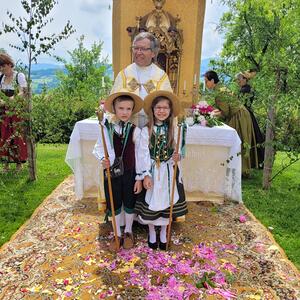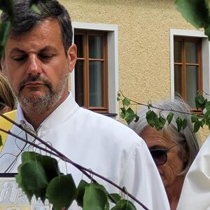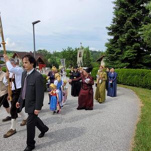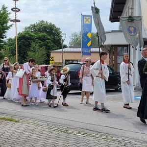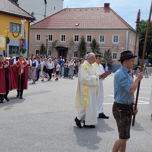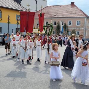 Angeführt von der Pfarrfahne marschierten die Musikkapelle, die Feuerwehr, der Kirchenchor, die Goldhaubengruppe, die weißen Mädchen, angeführt von den Schäfererkindern (heuer Luise Ganglbauer und Alexander Viehaus), den Gottesdienstleitern Ernest Ulbrich und Peter Voscak, den Himmel- und Laternenträgern mit Pfarrer Hofmann und dem Allerheiligsten und das ganze Pfarrvolk. Bei der 3. Station, der Marienkapelle, sangen die Erstkommunionkinder ein Lied und sprachen die Fürbitten. Bei der 4. Station vor der Kirche schloss die Feier mit dem Te Deum, "Großer Gott, wir loben dich". Das Ende fand in der Kirche mit dem letzten Segen statt.