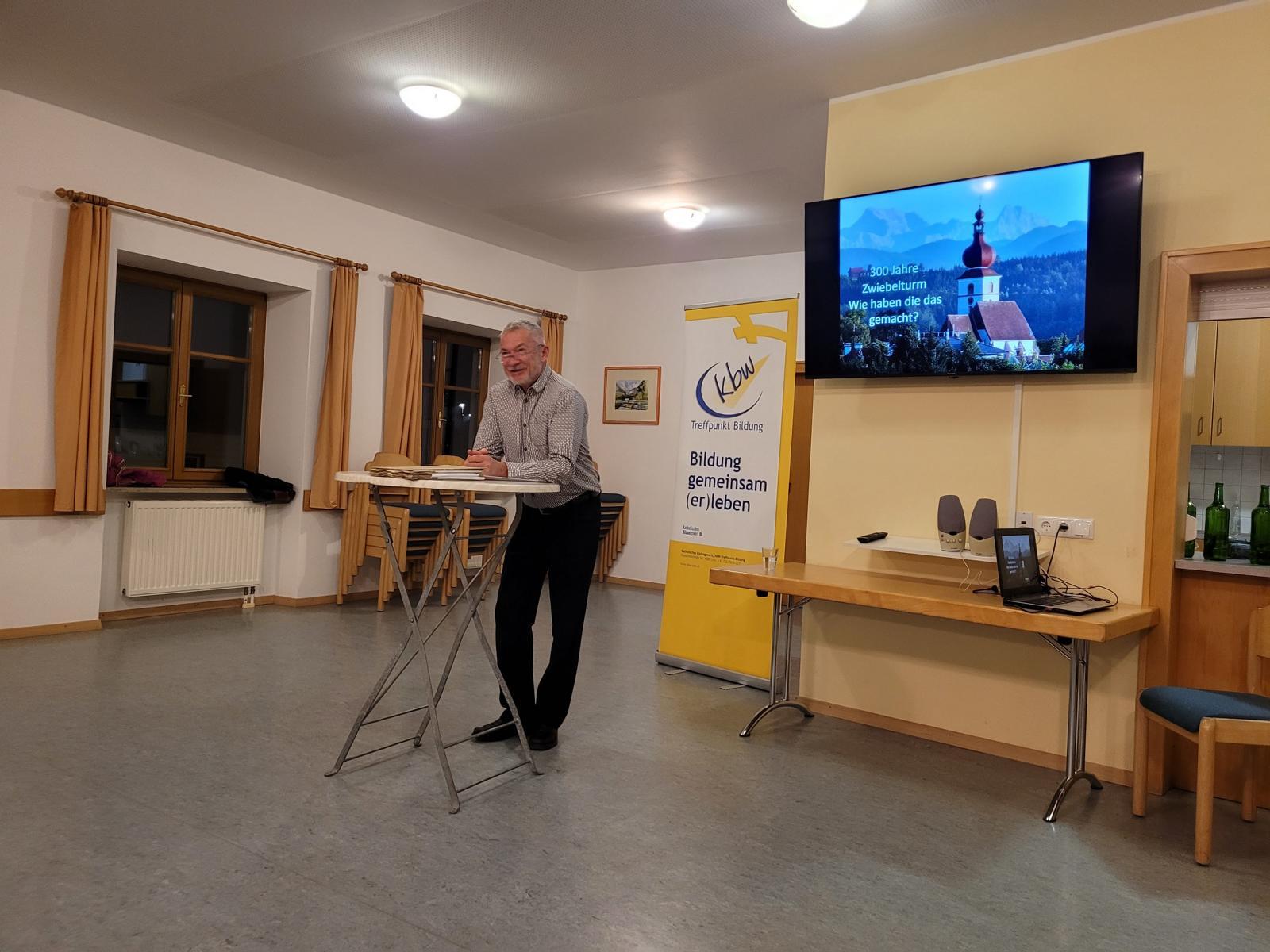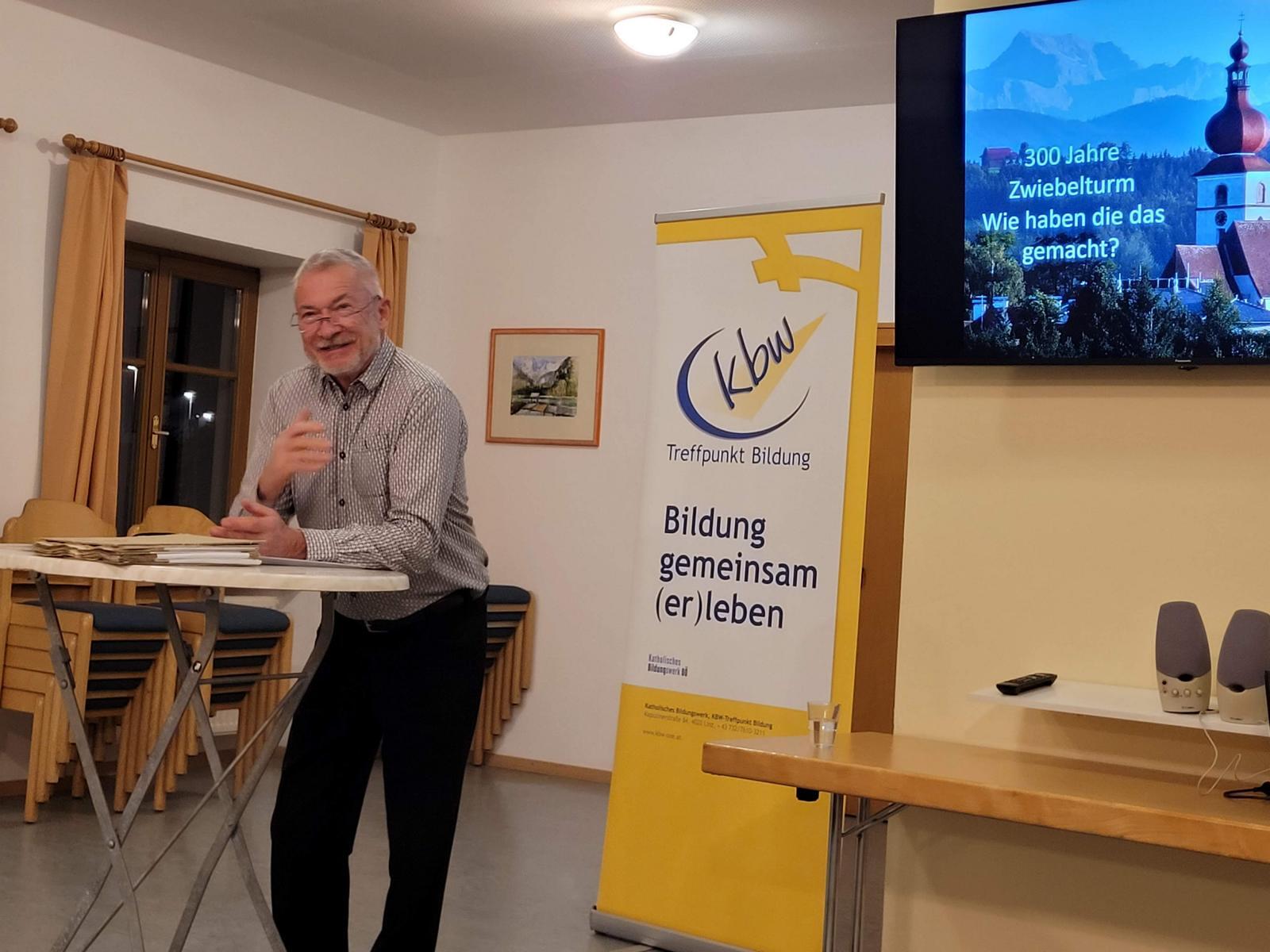 Mit Zeichnungen von der Gestalt der Barockkuppel bis hin zu der Analyse des einstigen Glockengeläutes gab es interessante Aspekte des Turmbaus. Dazu waren eine große Menge an verschiedenen Handwerkern und Tagwerkern notwendig, die in den Lohnlisten aufscheinen. Mag. Ulbrich versuchte sogar, von jedem einzelnen die Herkunft zu ermitteln und kam drauf, dass die meisten Handwerker beim Turmbau aus Waldneukirchen stammten. Es handelte sich aber nicht um "Robot"-Arbeit, sondern um bezahlte Leistungen. Je höher der Turm wurde, umso höher wurden auch die Tageslöhne. Es gab also eine Art "Gefahrenzulage". Weder in den Sterbematriken noch im großen Akt des Turmbaus findet sich eine Eintragung über ein Unglück oder einen Todesfall. Es ging alles sehr gut voran und mit Allerheiligen war der Bau 1723 abgeschlossen. Da es keine Aufzeichnungen über den Ankauf von neuen Glocken gab, ist die Annahme berechtigt, dass die alten Glocken und auch der Glockenstuhl höher gehoben und weiter verwendet wurden.