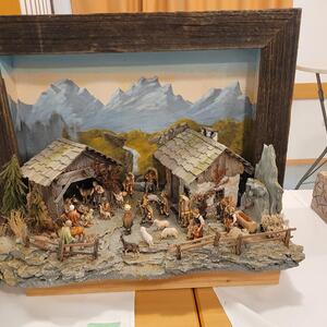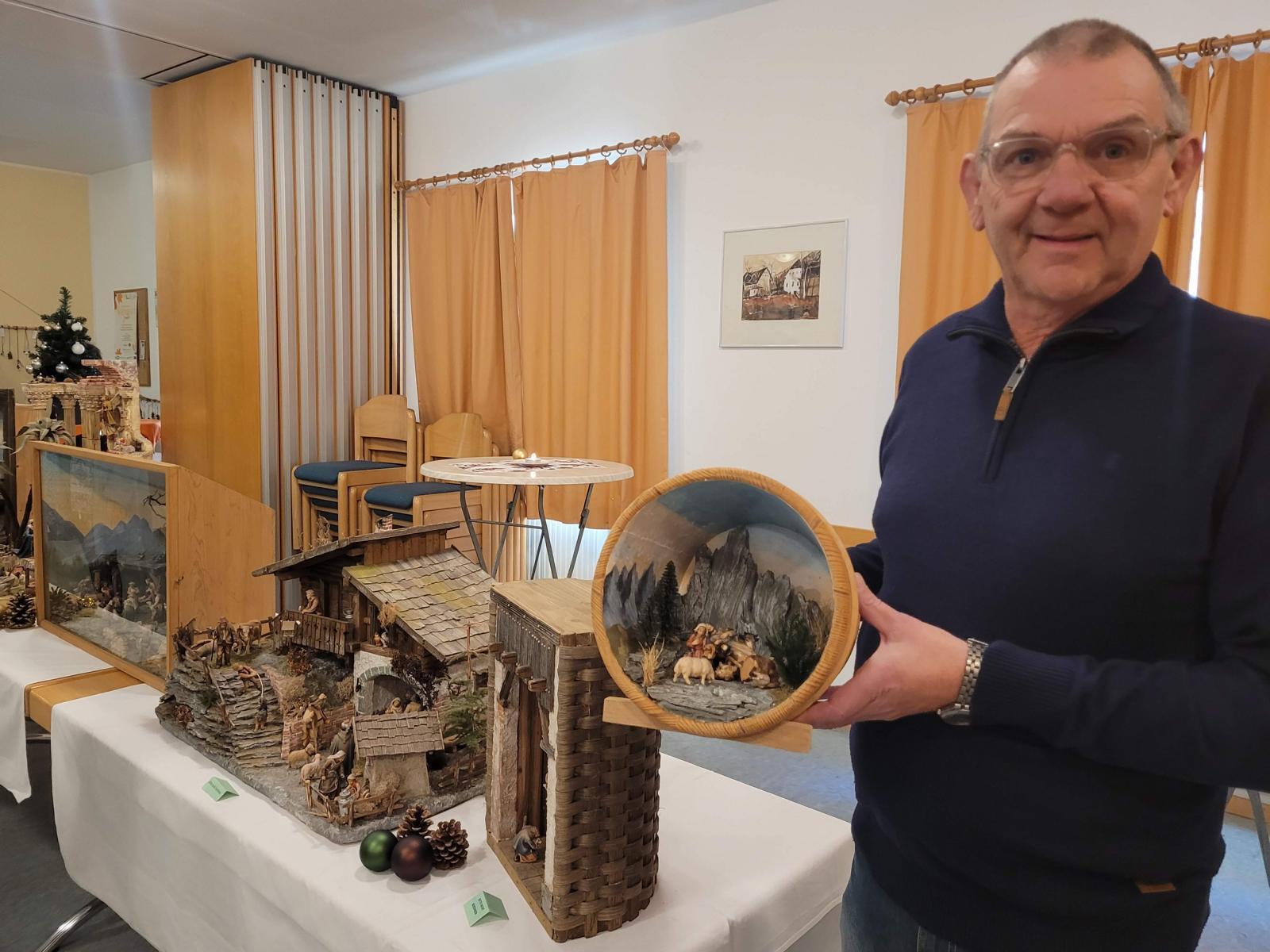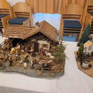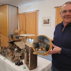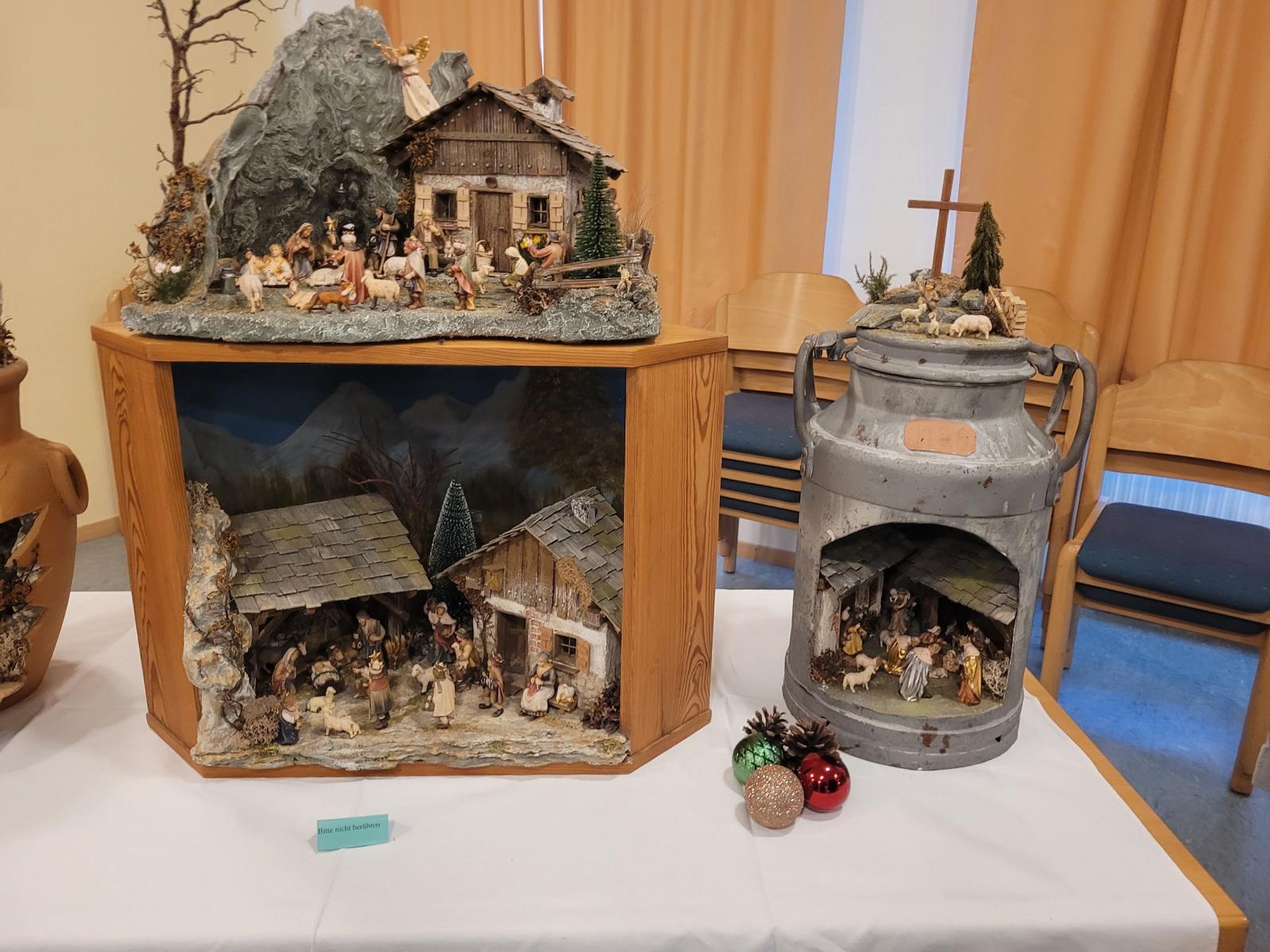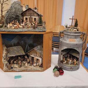Unter seinen Krippen befinden sich die klassischen Darstellungen als alpenländische und orientalische Krippe. Er zeigte aber auch sehr ungewöhnliche Objekte, wie die Krippe in der alten "Milchpitschen" oder im Sauna-Aufgusskübel. Fröhliches Geplauder, Interesse an den ausgestellten Werken und an der Handwerkskunst, besonders auch an den Bastelarbeiten der Diakoniewerkstätte kennzeichneten die zwei Tage.