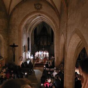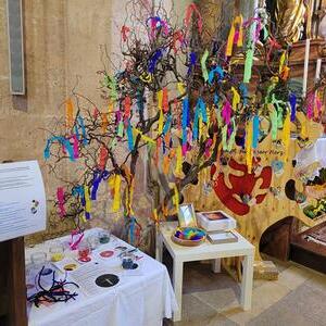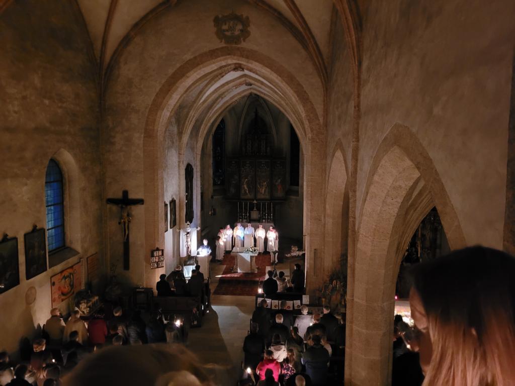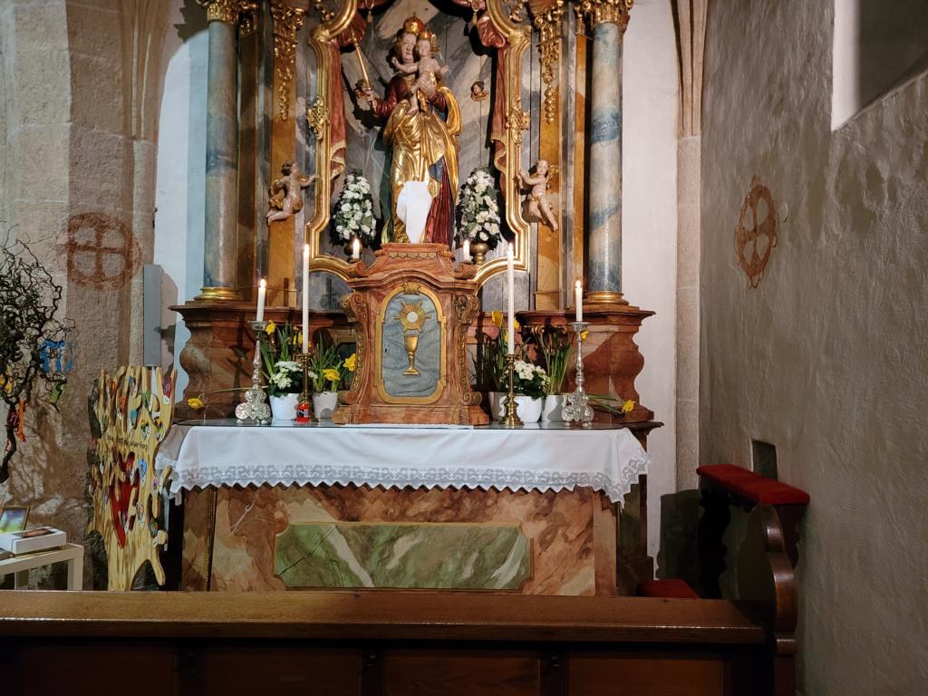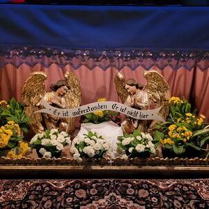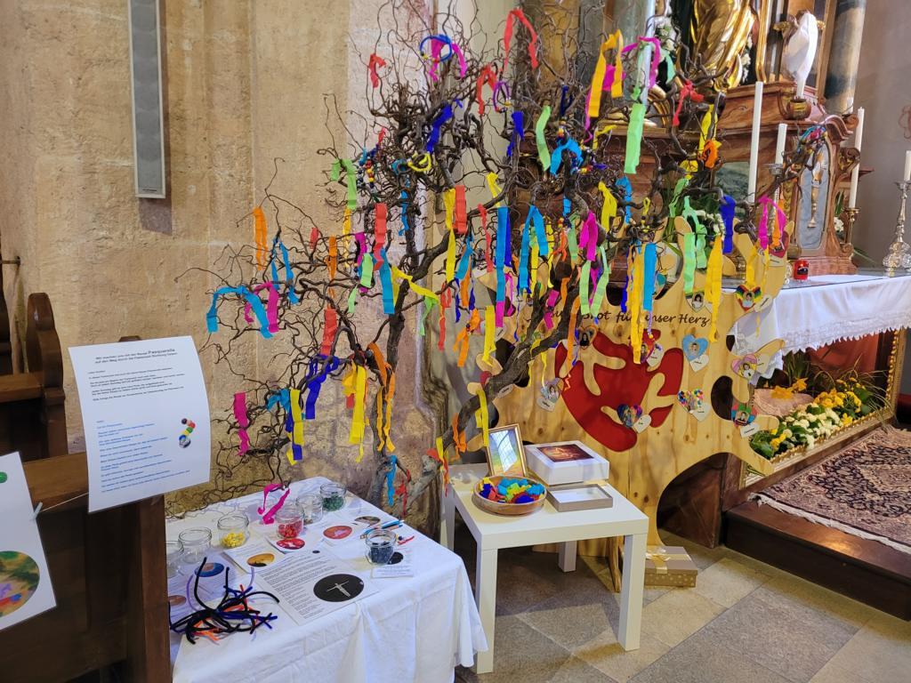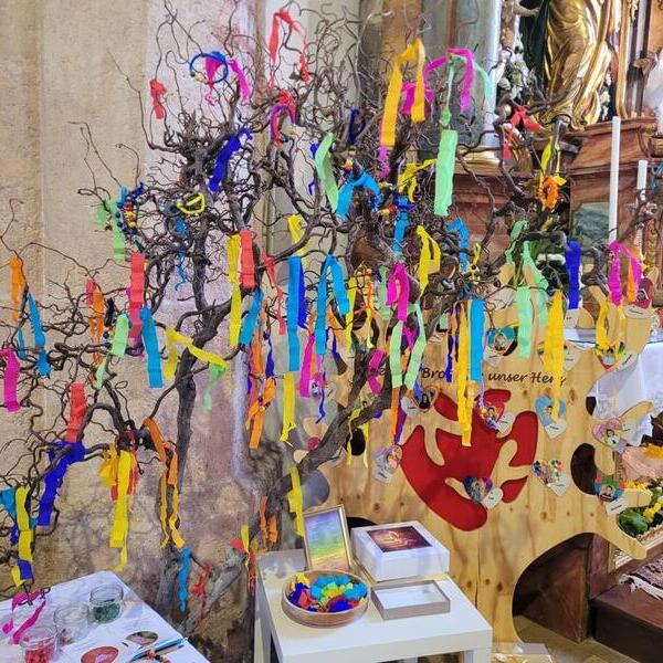 Am Ostersonntag lud die Kinderliturgiegruppe Feliggs die Kleinsten mit ihren Eltern in den Pfarrsaal ein. Feierlich zogen sie beim "Vater Unser" in die Kirche ein und erfreuten mit einem fröhlichen "Halleluja" nach der Kommunion die Pfarrgemeinde. Bunte Bänder am Osterbaum brachten die Lebendigkeit der Kinder und ihre Bitten zum Ausdruck.