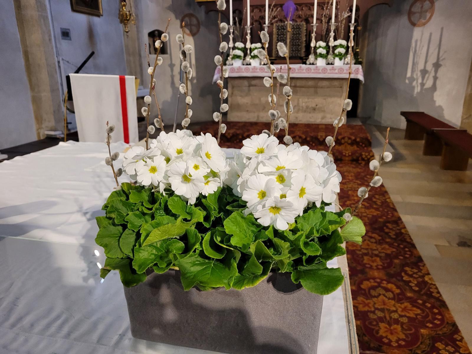 Verregnet und sehr kühl war der heurige Palmsonntag, 2. April. Trotzdem führte die Musikkapelle den Zug mit Pfarrer Alois Hofmann, Ministranten und vielen Kindergartenkindern mit ihren Eltern an, um die Palmweihe bei der Marienkapelle zu feiern.