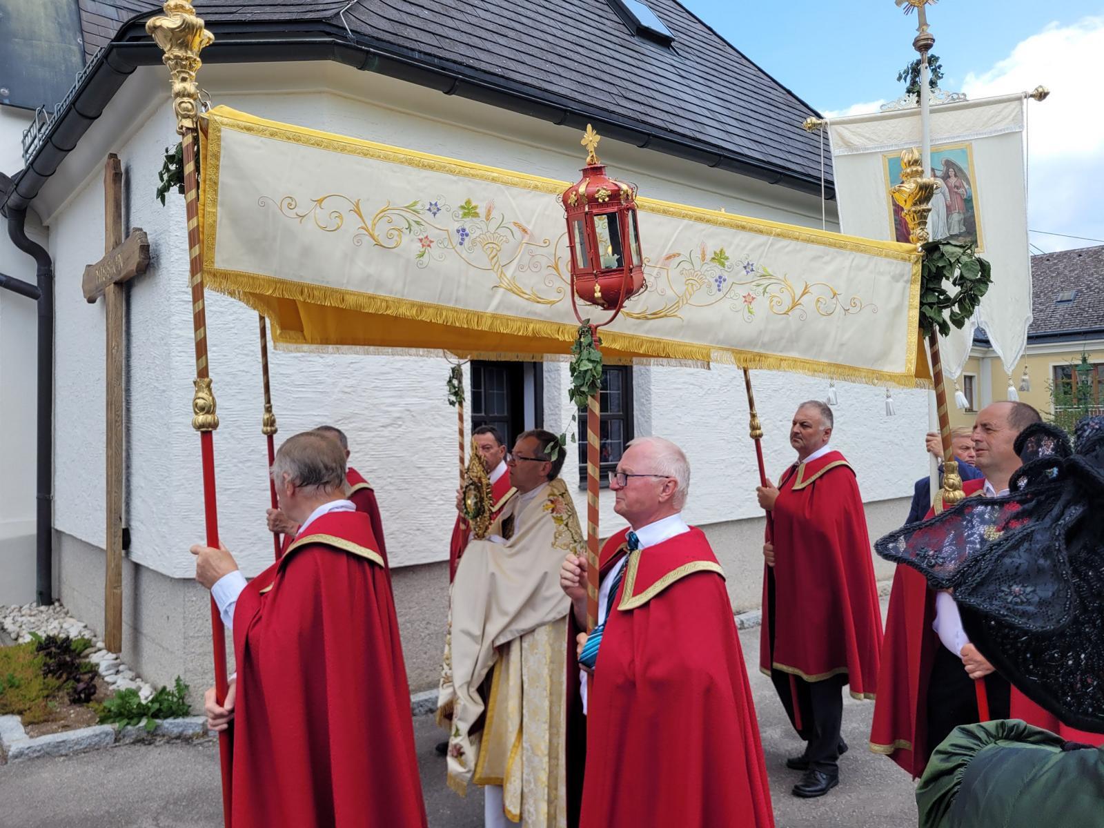 Am Donnerstag, den 16. Juni 2022 feierte die Pfarre das Fronleichnamsfest. Der Festgottesdienst um 9 Uhr wurde vom Kirchenchor feierlich gestaltet. Im Anschluss begann die Prozession mit den vielen Formationen von Musikkapelle, Feuerwehr, Kirchenchor, Jugend, Erstkommunionkinder, angeführt von den Schäfererkindern Klara und Matheo, gefolgt vom "Himmel" mit Pfarrer Hofmann, der erstmals von den 3 Gottesdienstleitern begleitet wurde.