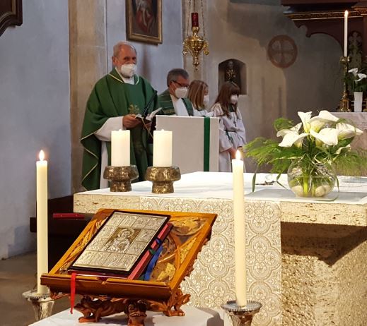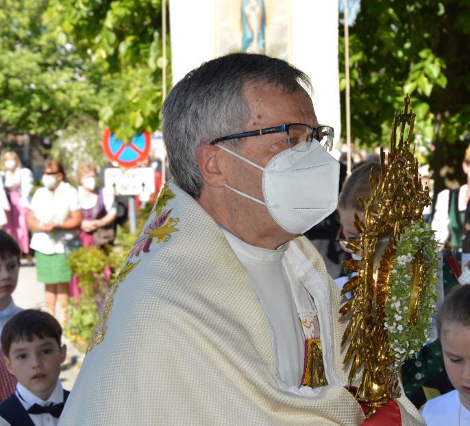 In Zeiten von Corona-Sicherheitsbestimmungen fand das Fronleichnamsfest am 3. Juni 2021 statt. Mit sehr großer Disziplin wurden die Abstandsregel, FFP2-Maske Pflicht eingehalten und die verkürzte Prozession auf drei Stationen abgehalten.