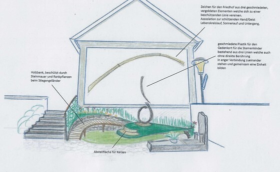 Die Erinnerungsstätte an unsere Sternenkinder soll im unteren Teil des Friedhofs, direkt an die Nordseite des Gräberhäuschens anschließen.