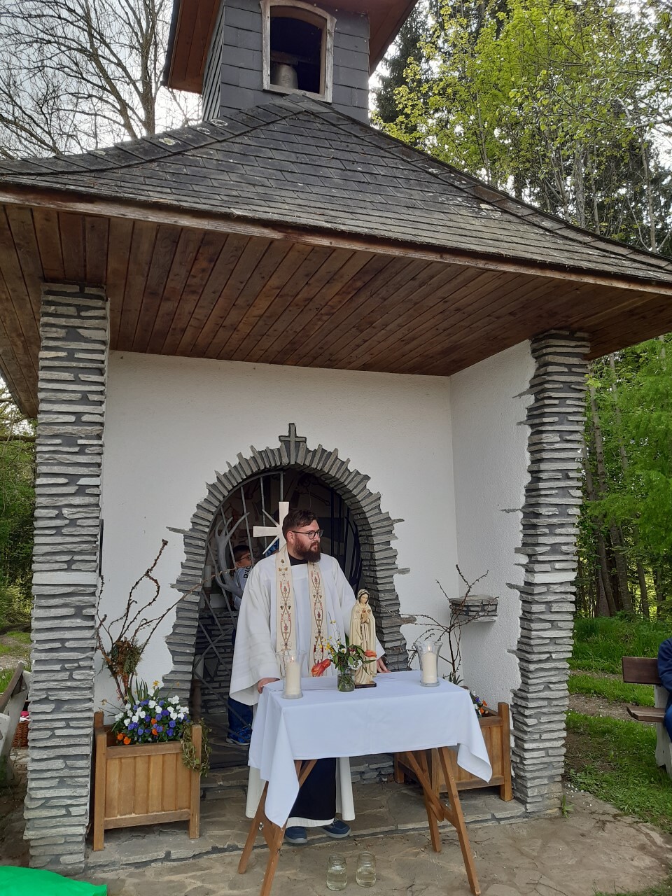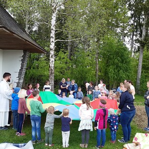 Gemeinsam mit P. Jakobus und vielen Familien mit Kindern feierten wir am 6. Mai 2023 bei der Hubertuskapelle eine Kindermaiandacht.
